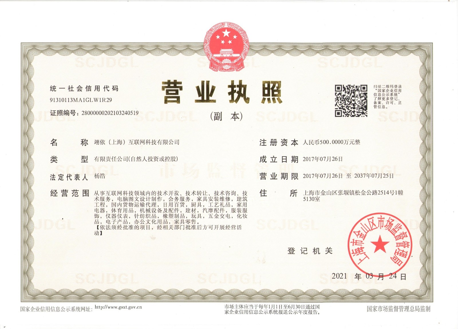 - 經營范圍:從事互聯網科技領域內的技術開發、技術轉讓、技術咨詢、技術服務,電腦圖文設計制作,會務服務,家具安裝維修,建筑工程,國內貨物運輸代理,日用百貨,廚具,工藝禮品,家用電器,體育用品,機械設備及配件,建材,汽摩配件,服裝服飾,儀器儀表,針紡織品,橡塑制品,玩具,五金交電,化妝品,電子產品,辦公文化用品,家具零售?!疽婪毥浥鷾实捻椖浚浵嚓P部門批準后方可開展經營活動】