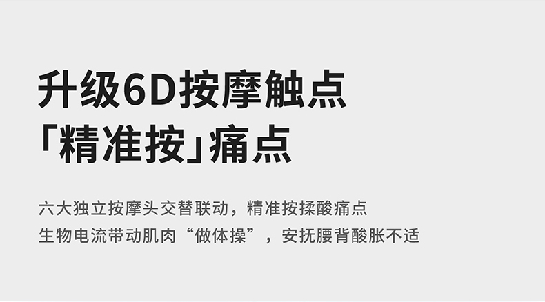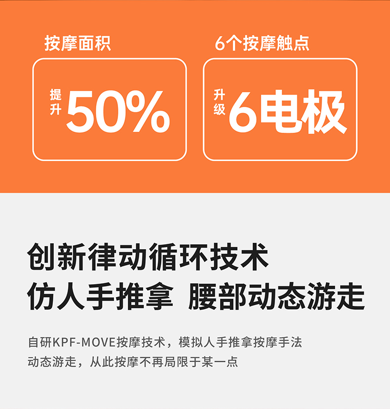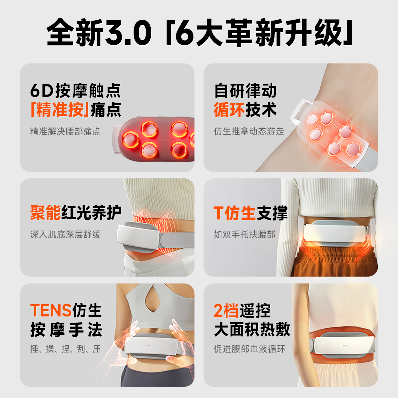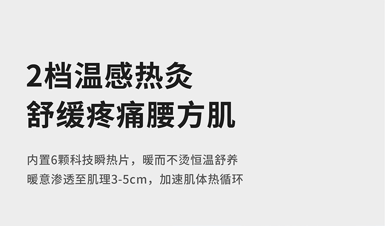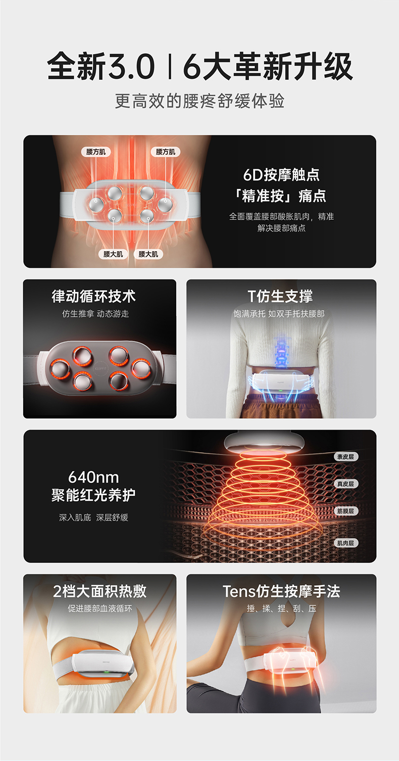 1.Tens脈沖,紅外熱敷理療 2.6大按摩頭都是獨立分區,律動交替式循環按摩方式,按摩的時候如流水般在腰部游走。 3.四種按摩手法,(刮痧敲打指壓針灸) 4.兩檔溫度:38度,42度 5.15檔按摩力度可調節,遙控帶數顯。 6.自動定時:5、10、15、20、25、30分鐘 7、充電時長≤3h,使用時長≥2h(最大功耗)