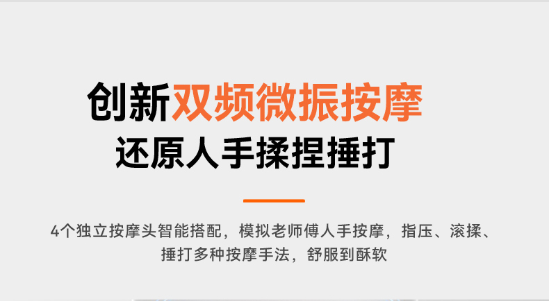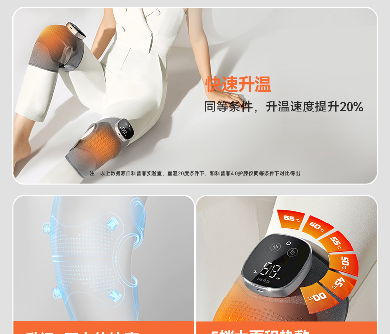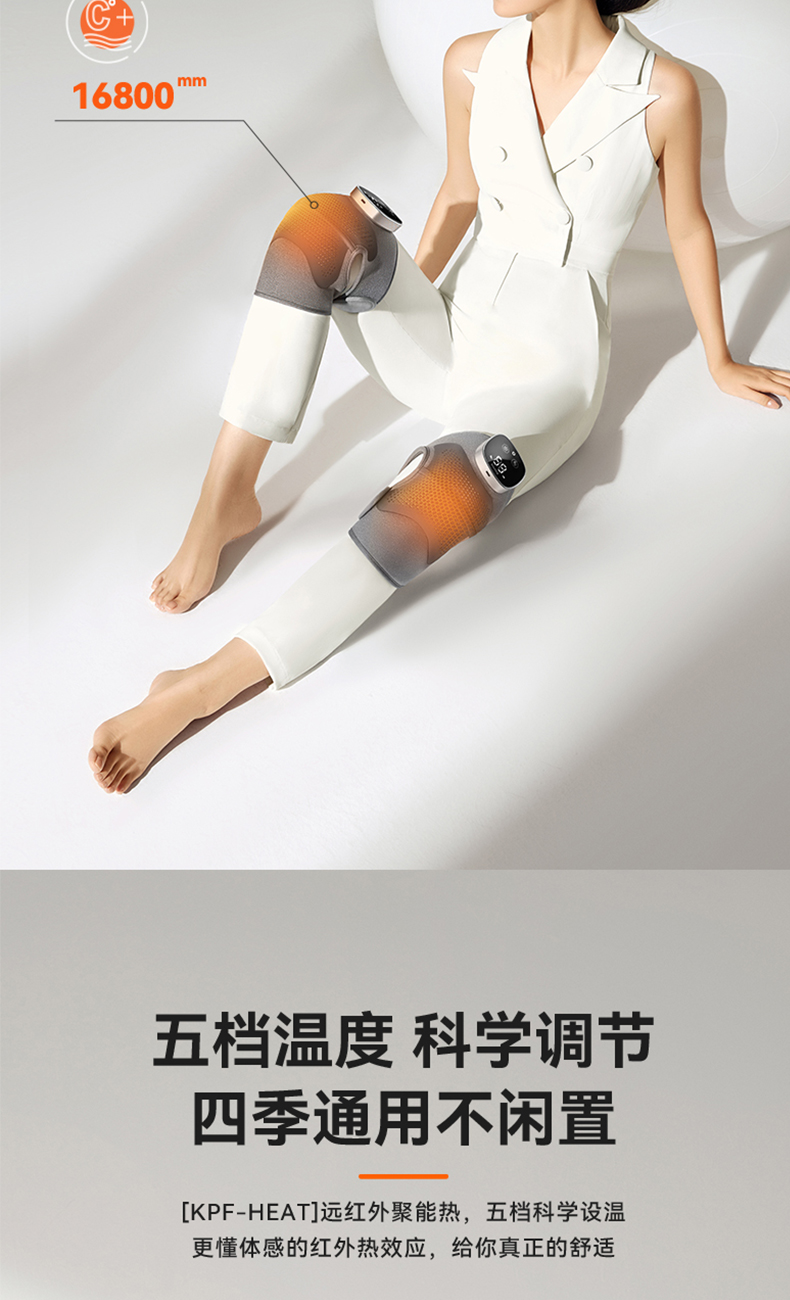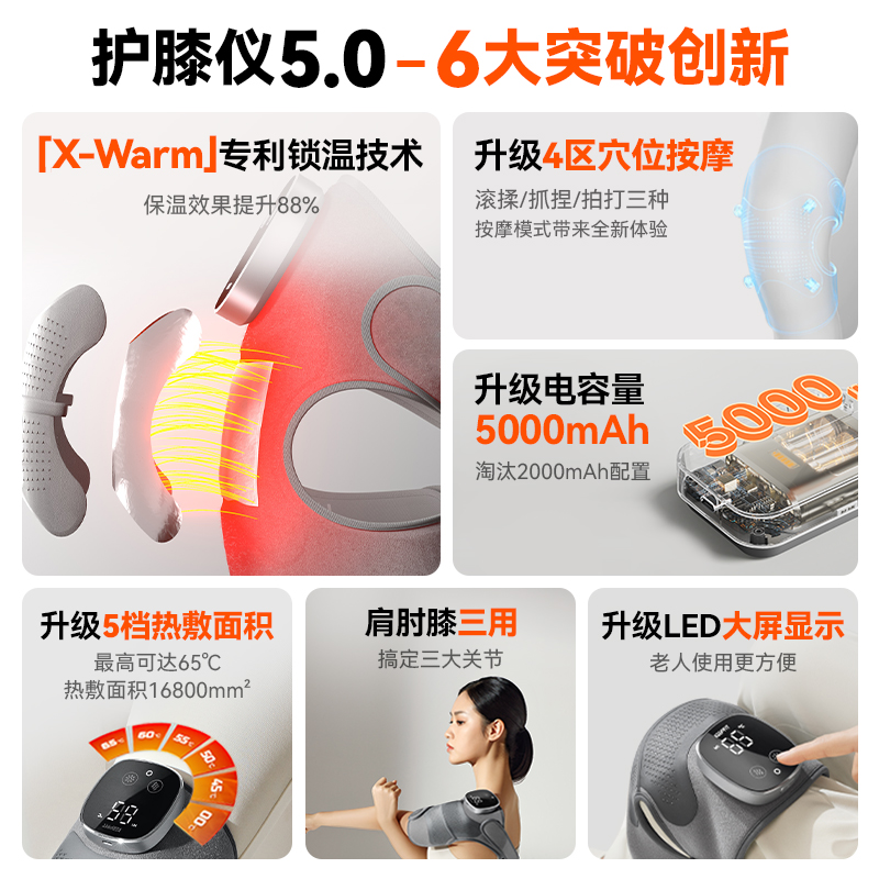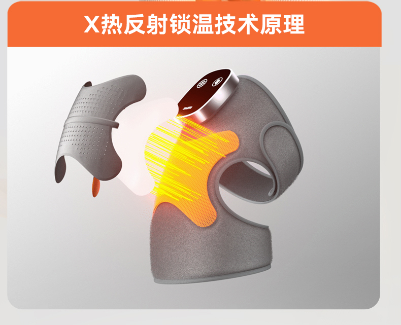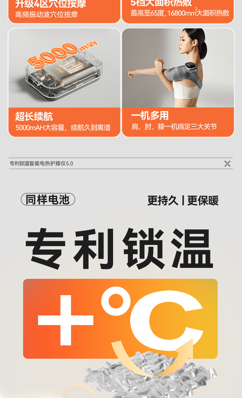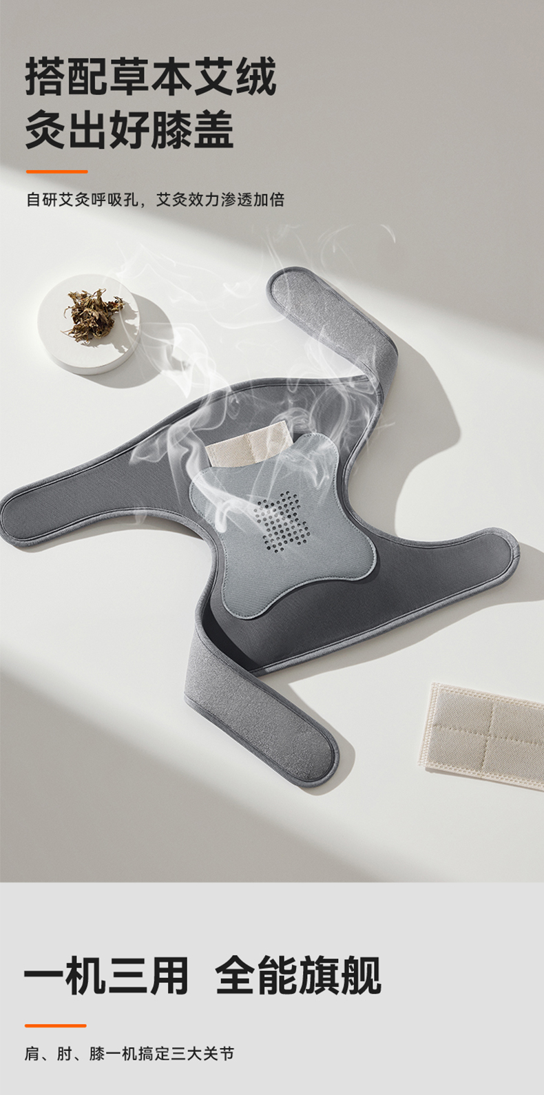 1.肩部,膝蓋,手肘(多功能按摩器)有配1根延長帶_x005f2.液晶數顯、觸屏操作,銀離子反射層+SBR雙重鎖溫 3.168cm2發熱面積 ,石墨烯發熱片5秒速暖 4.四區按摩獨立控制,可有多種按摩組合 4.電池容量5000毫安,僅按摩可用7天(每天用一次) 5.三檔模式、五檔溫度調節( 45、50、55、60、65) 6.外層:PU皮料+OK布,內襯:健康布+提花萊卡料 7.殼料采用防火料,NTC控溫設計,安全系數高。