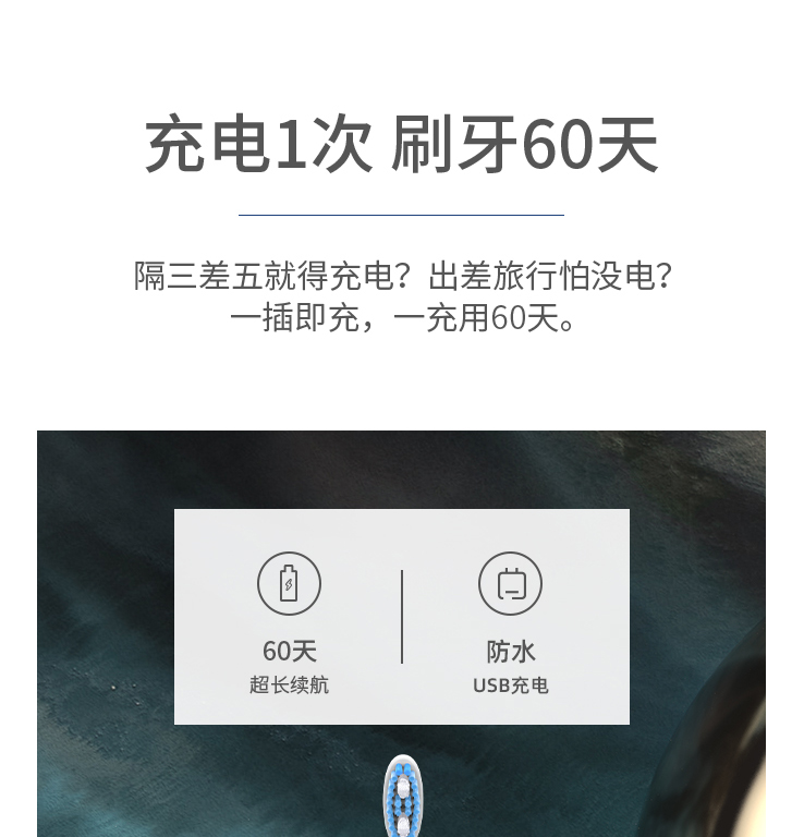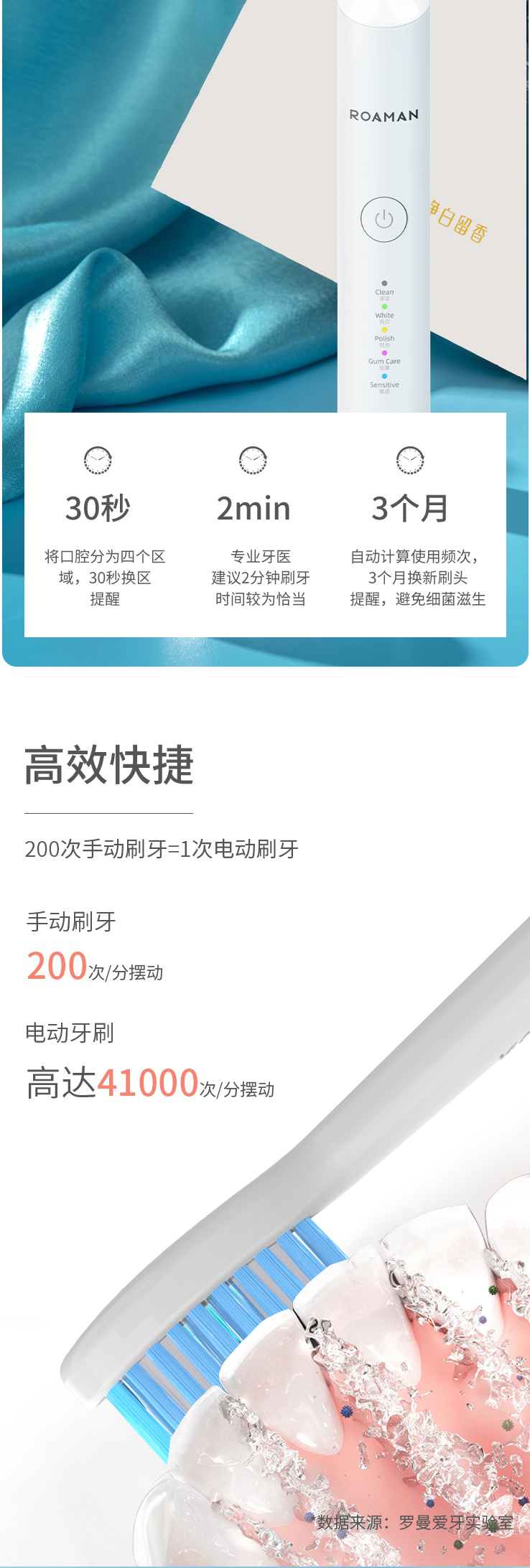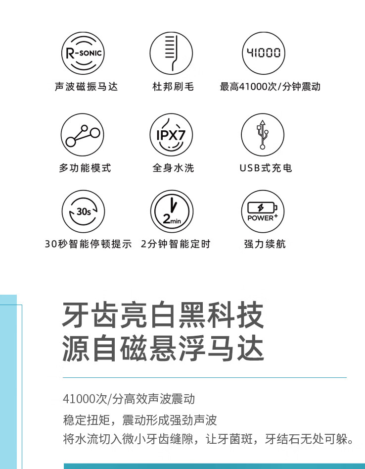 磁懸浮聲波專利馬達 41000次/分鐘聲波震動 時間提醒功能:30秒震動換區,2分鐘到時提醒 IPX7級全身水洗,可淋浴 超長續航60天
