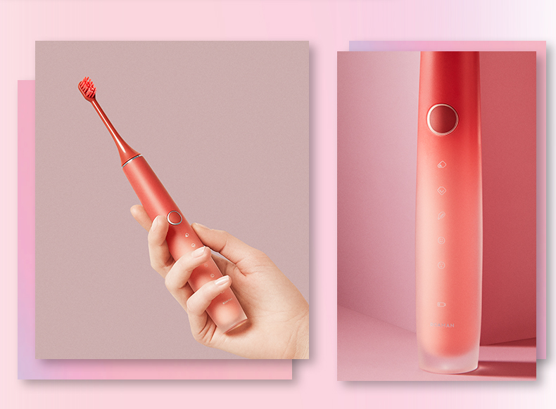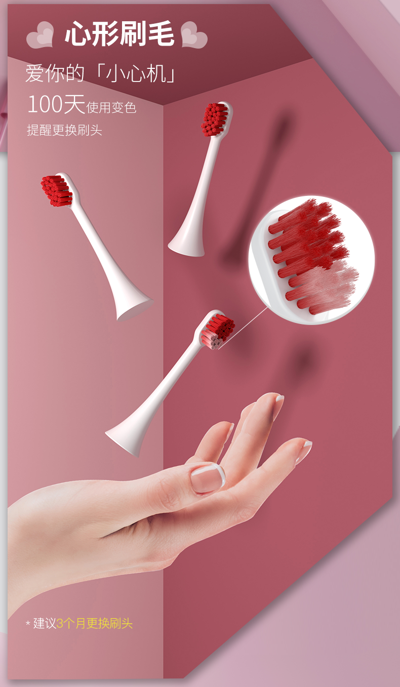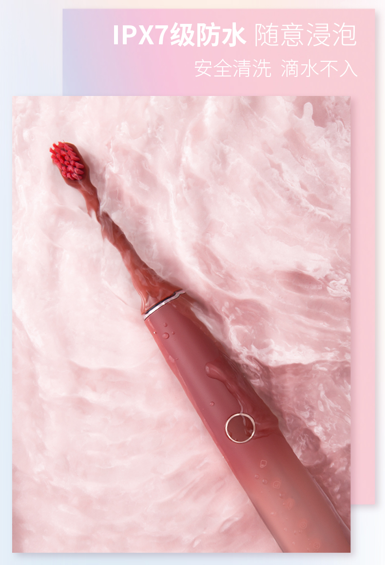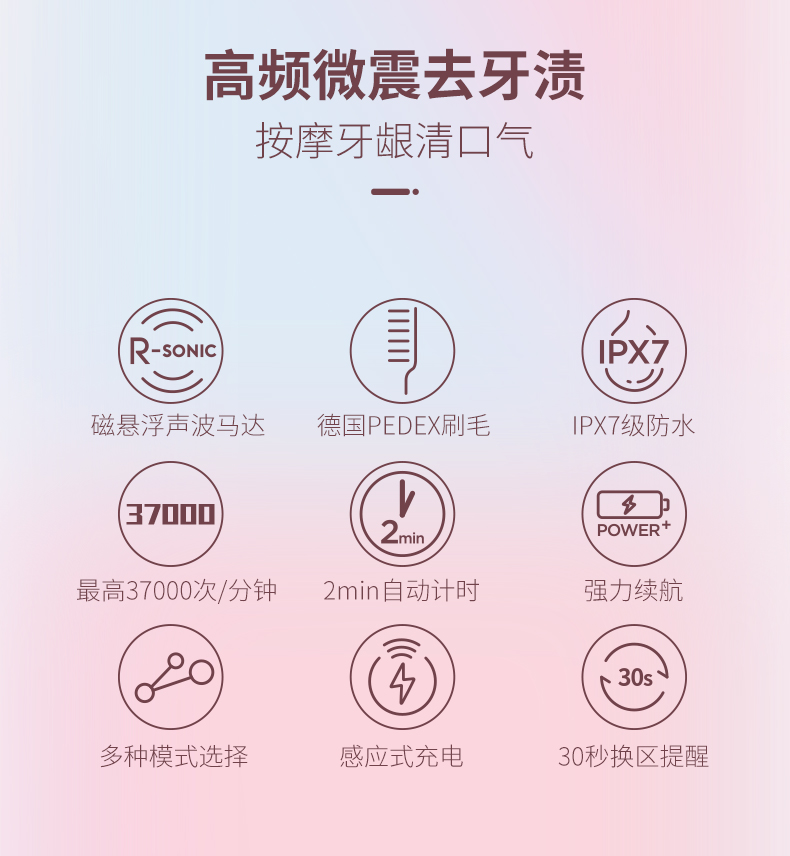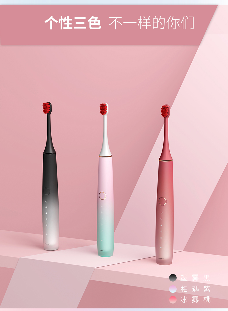 冰霧漸變機身,潮酷吸睛外觀, 刷牙洗臉二合一 德國PEDEX心型變色刷毛,一百天提醒更換 國內領先磁懸浮馬達,振動頻率最高可達3700次/分鐘 五種刷牙潔面模式:清潔/亮白/敏感/潔面/按摩 IPX7級防水,全身可水洗 3種刷頭五種功能:美白、護齦、潔面一機到位 感應充電方式,充電一次續航60天