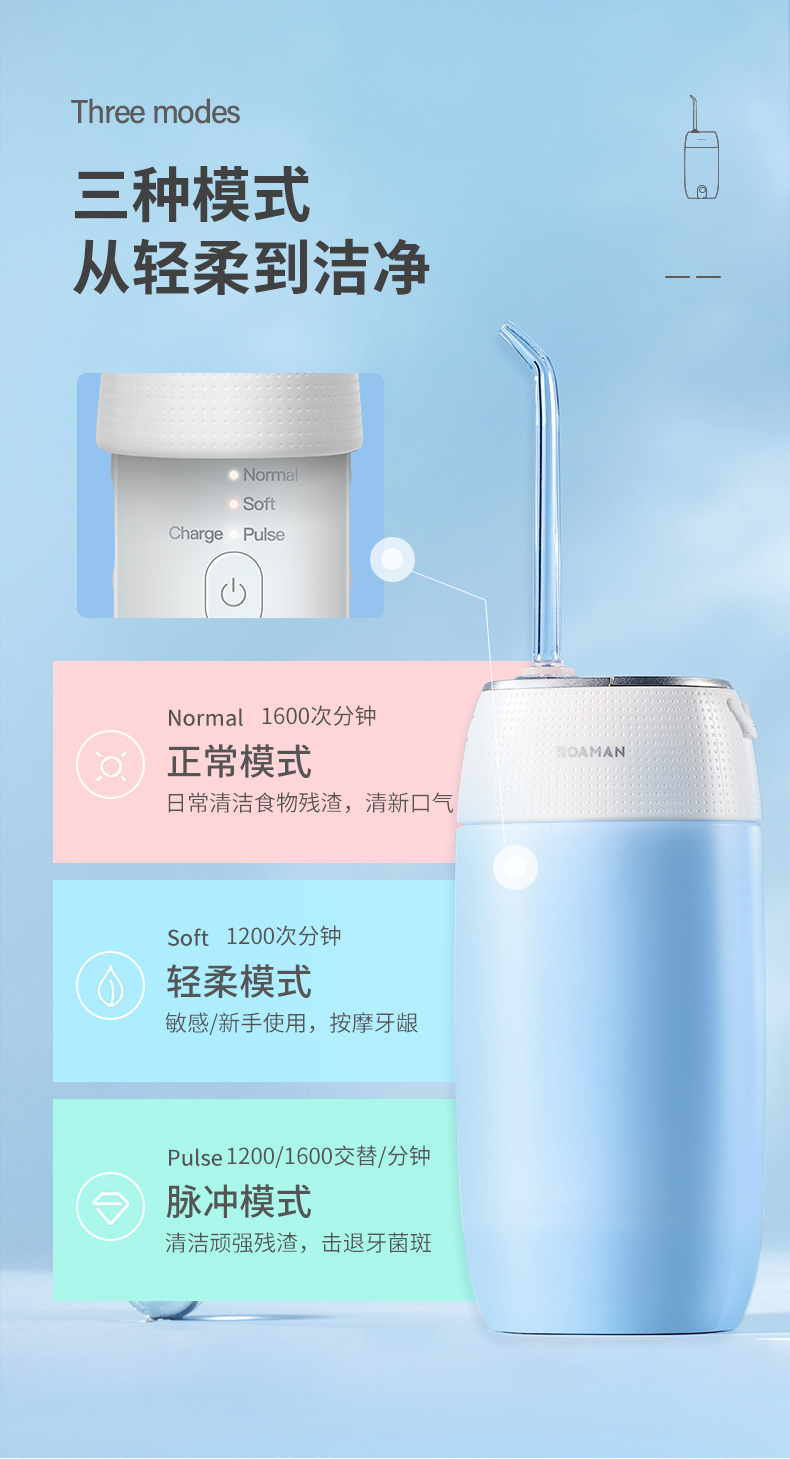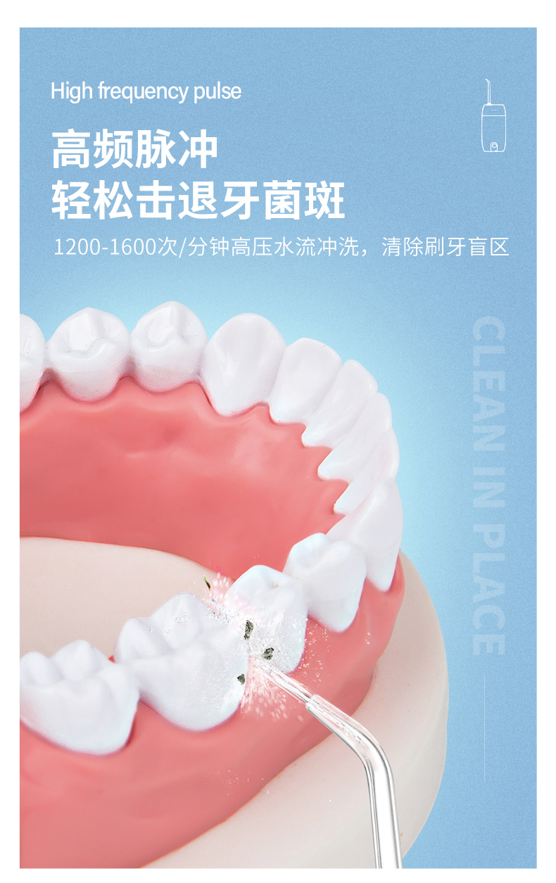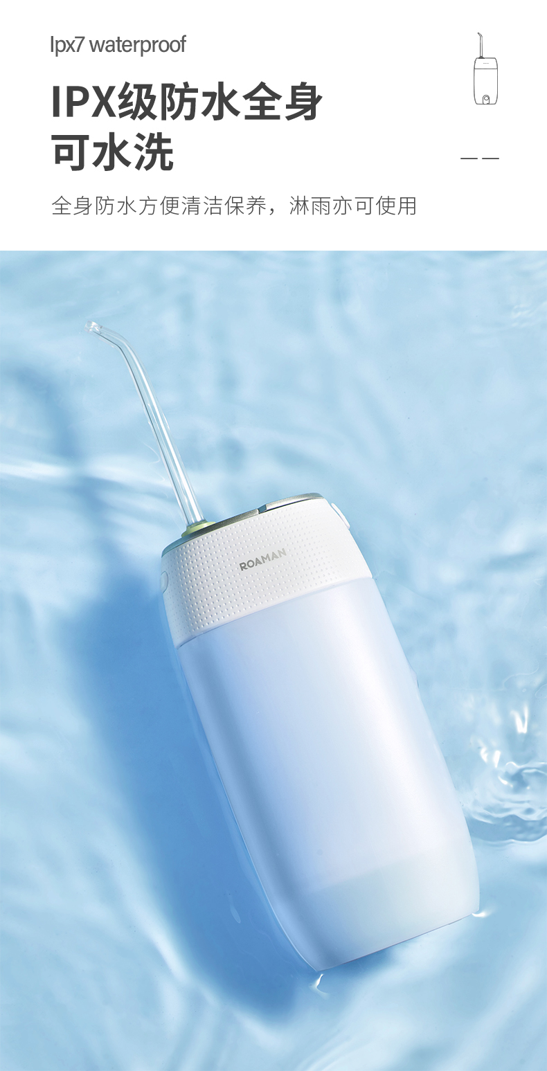 1.3種模式(標準|輕柔|脈沖) 2.1600次/分高頻脈沖高效潔力 3.360°可旋轉噴嘴、 FDA食品級材質,1分鐘智能計時 4.120ml迷你水箱,小巧適用 5.IPX7級全身水洗設計,通用USB充電接口 6.110-240V全球通用電壓,充電隨行,旅行無憂 7.30天超長續航時間