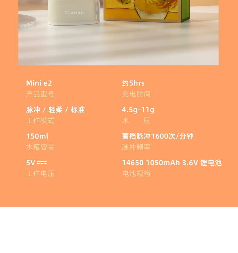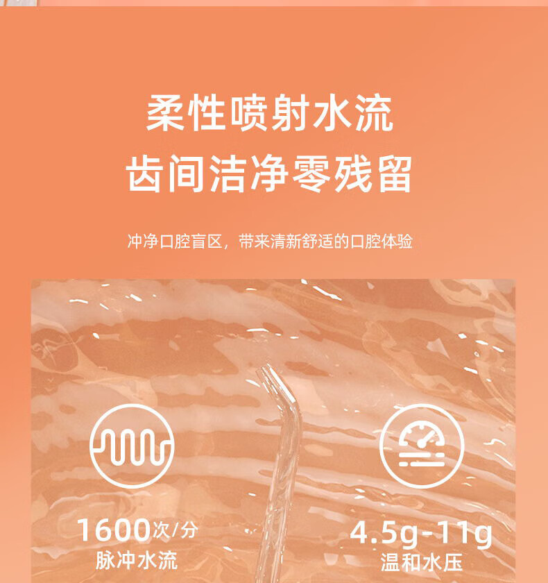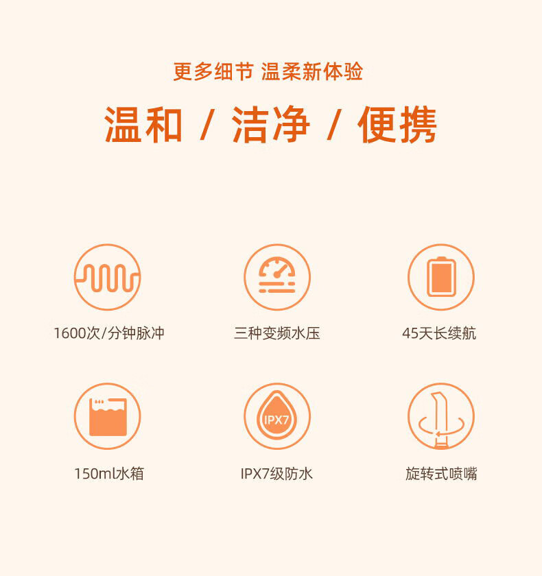 +1600次/分高頻脈沖,0.6mm細膩水柱 +3種私藏模式,4.5-11g溫柔水壓,柔軟體驗 +可360°旋轉噴嘴,采用FDA食品級材質,1分鐘智能計時 +擁有150ml水箱,輕松使用 +IPX7級全身水洗,可淋浴 +磁吸式感應充電 ,超長續航45天