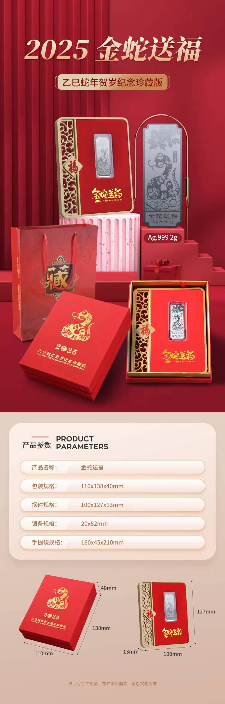 保險開門紅好禮,好運連連,禮遇非凡,蛇年賀歲紀念珍藏 將傳統生肖元素與現代審美巧妙結合,采用珍貴純銀材質,打造出紀念銀章,既可當擺件觀賞,亦可收藏留念 蛇則有著豐富多彩的象征意義,通常被視為神秘、智慧和保護的象征。