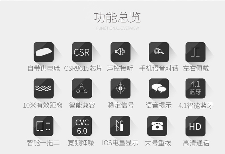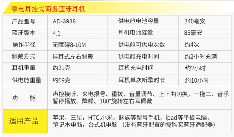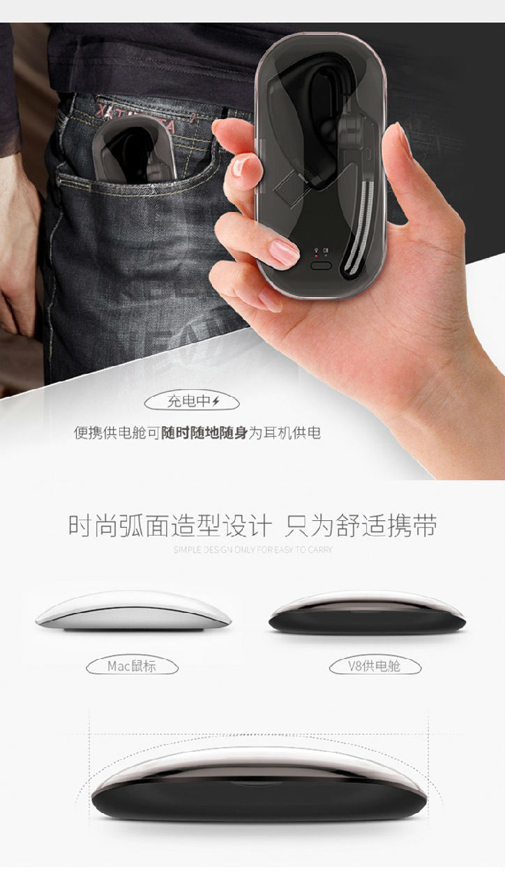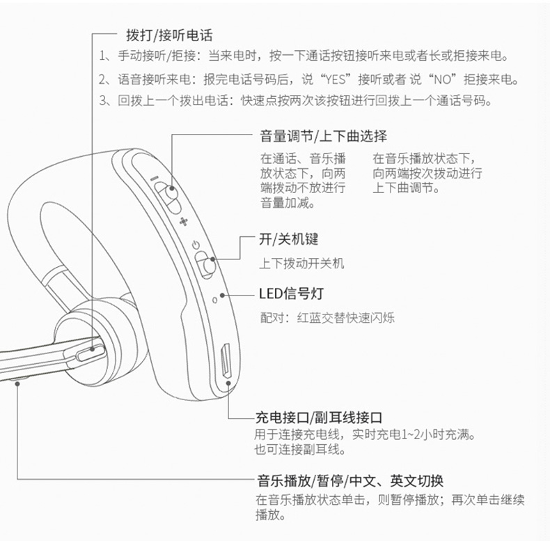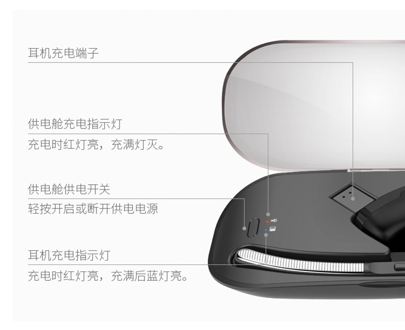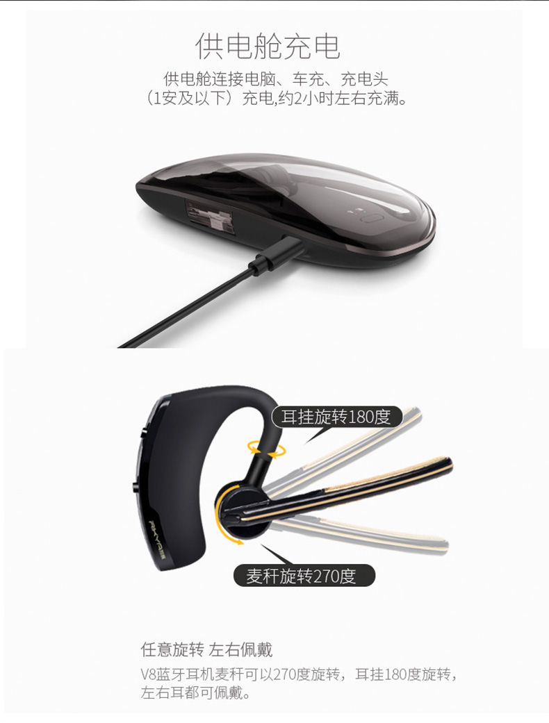 4、聲控接聽,來電播報,重播音量調節,上下切換,180度左右耳佩戴,自帶供電倉