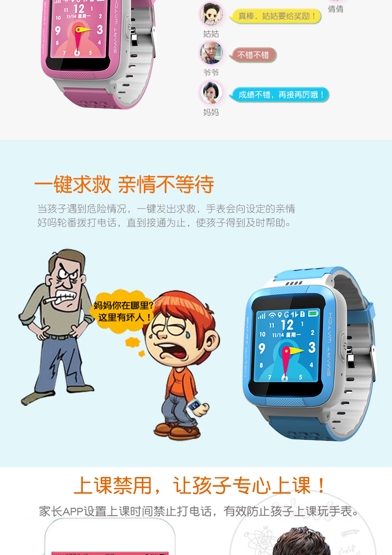 3、語音聊天,想聊就聊,一鍵求救,親情不等待,上課禁用;