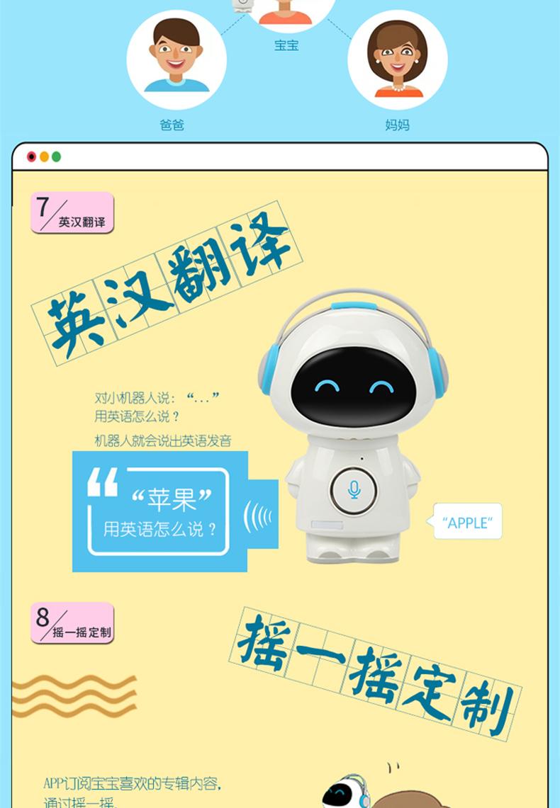 2、趣味變聲、時光膠囊、故事兒歌、兒童社交、啟蒙英語、故事DIY、智能監(jiān)聽;