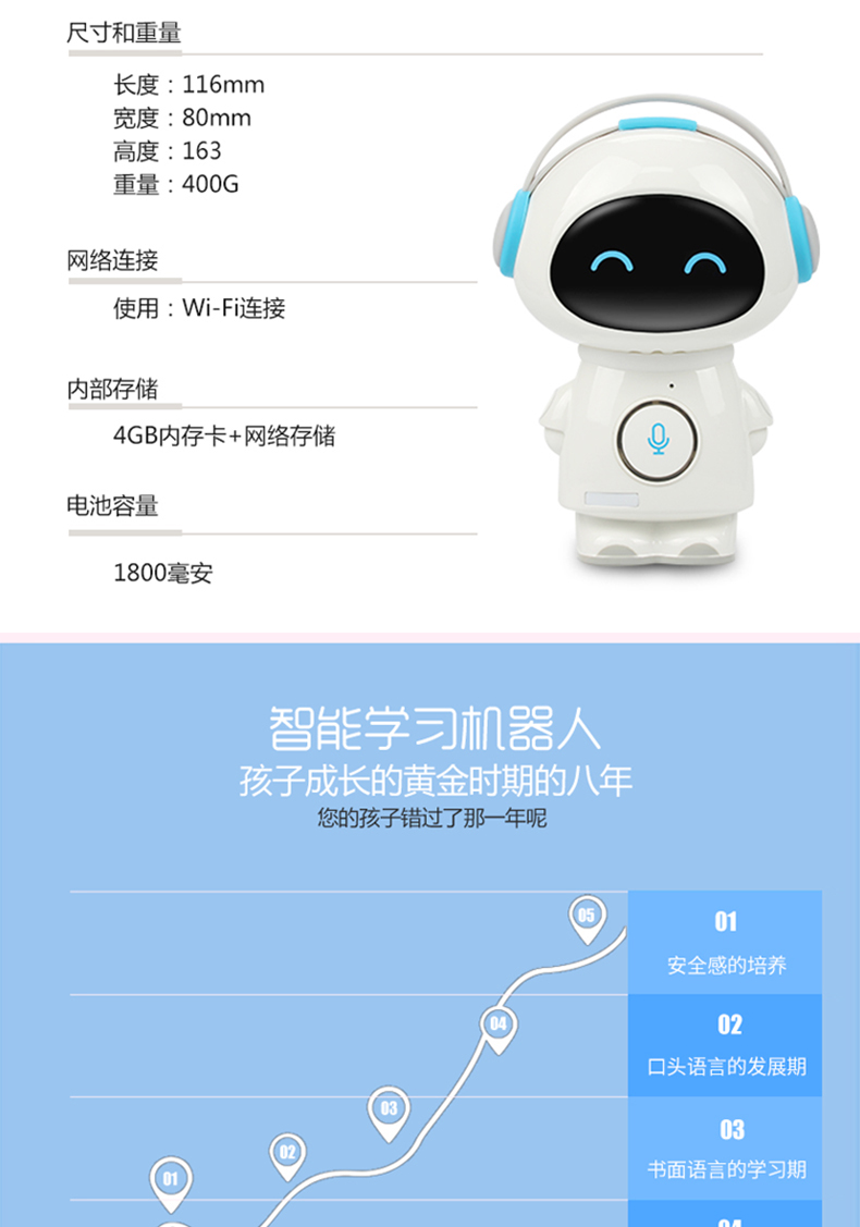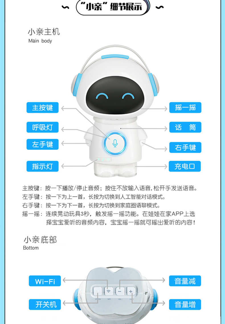 1、wifi連接,人工智能、語音聊天、全家群聊、微信聊天,隨時歡暢聊天;