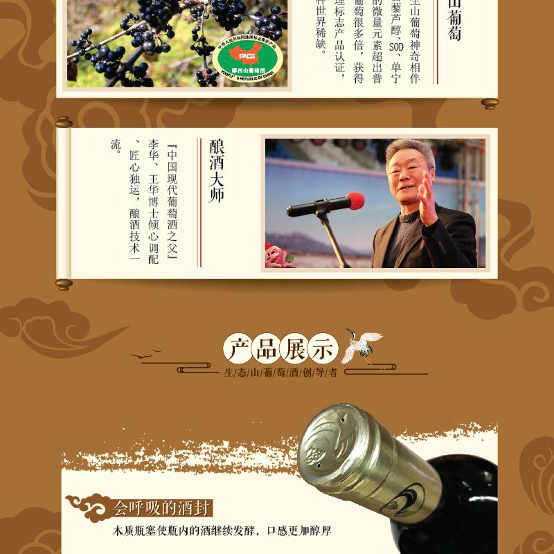 武當紅生態山葡萄酒,產自著名的梅諾克酒莊,其擁有20萬畝的野生葡萄基地。武當紅有機野生山葡萄酒的單寧含量是普通葡萄酒的10倍,白藜蘆醇含量是普通葡萄酒的2-3倍。白藜蘆醇被稱為植物抗毒素,對腫瘤、動脈硬化、心腦血管疾病都有著不可替代的預防及治療作用。武當紅有機野生山葡萄酒將高品質的生活態度與品酒結合,讓生活更富有內涵。