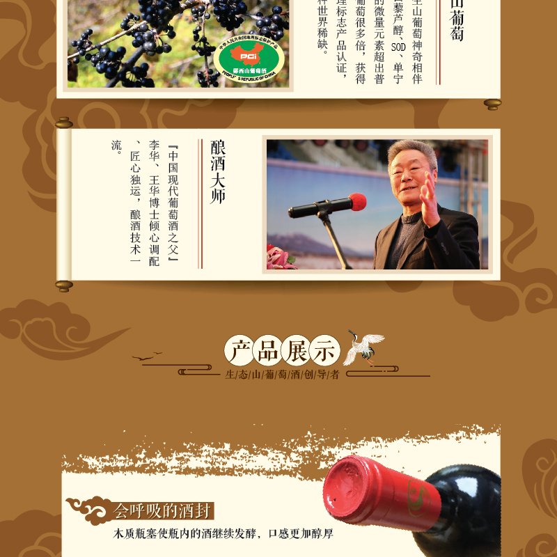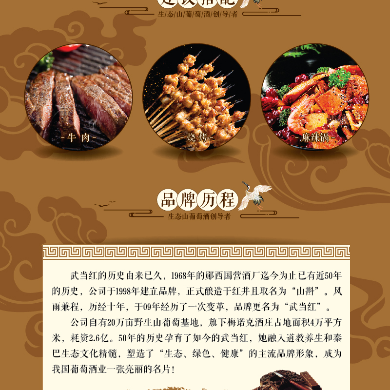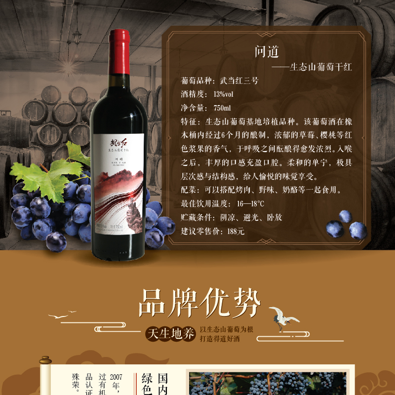 武當紅生態山葡萄酒,產自著名的梅諾克酒莊,其擁有20萬畝的野生葡萄基地。武當紅有機野生山葡萄酒的單寧含量是普通葡萄酒的10倍,白藜蘆醇含量是普通葡萄酒的2-3倍。白藜蘆醇被稱為植物抗毒素,對腫瘤、動脈硬化、心腦血管疾病都有著不可替代的預防及治療作用。武當紅有機野生山葡萄酒將高品質的生活態度與品酒結合,讓生活更富有內涵。