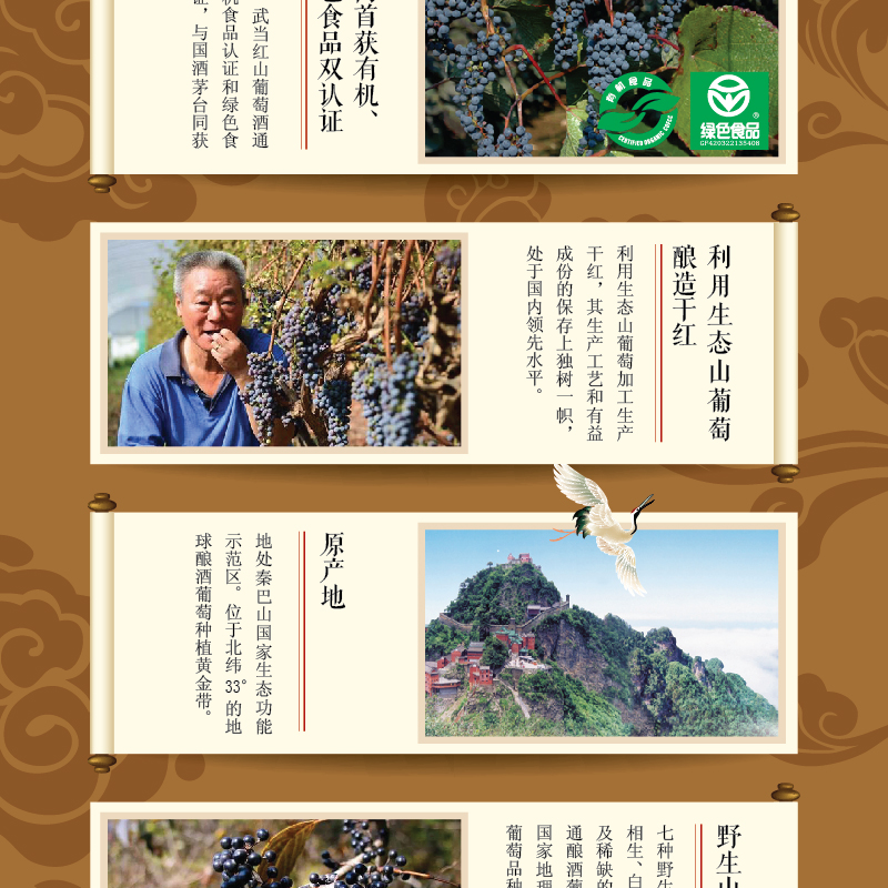 武當紅生態(tài)山葡萄干紅,產自著名的梅諾克酒莊,其擁有20萬畝的野生葡萄基地。武當紅有機野生山葡萄酒的單寧含量是普通葡萄酒的10倍,白藜蘆醇含量是普通葡萄酒的2-3倍。白藜蘆醇被稱為植物抗毒素,對腫瘤、動脈硬化、心腦血管疾病都有著不可替代的預防及治療作用。武當紅有機野生山葡萄酒將高品質的生活態(tài)度與品酒結合,讓生活更富有內涵。