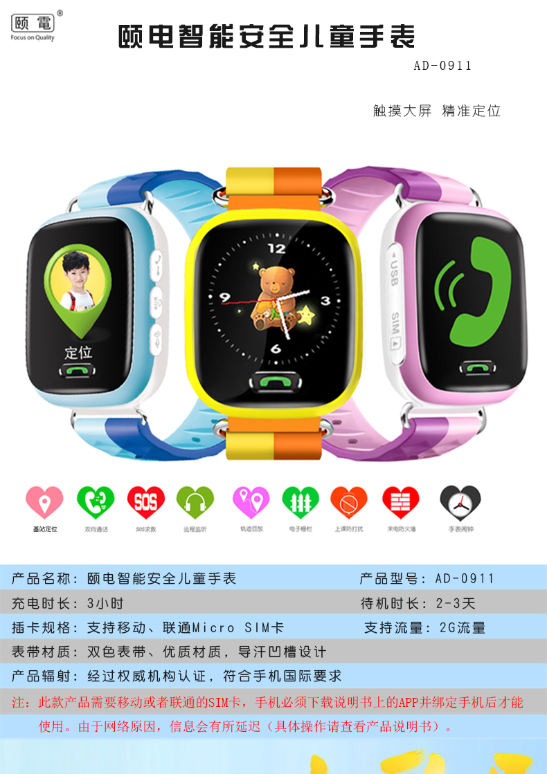 頤電 兒童智能大屏定位防丟手表 支持移動、聯通2G/3G信號Mirco SIM卡AD-0911