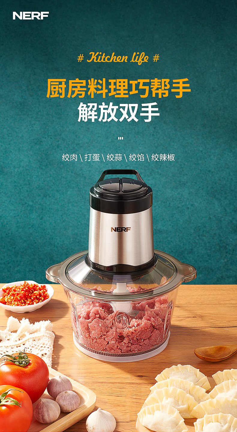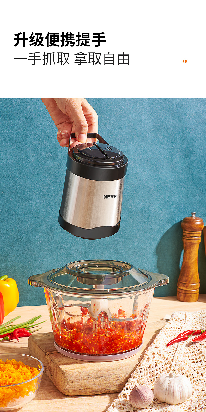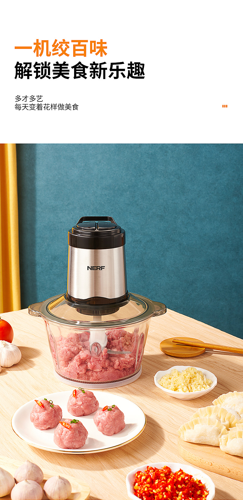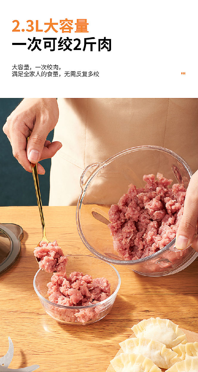 兩檔調(diào)速,自由掌控細(xì)膩度,2.3L大容量,一次可絞兩斤肉
