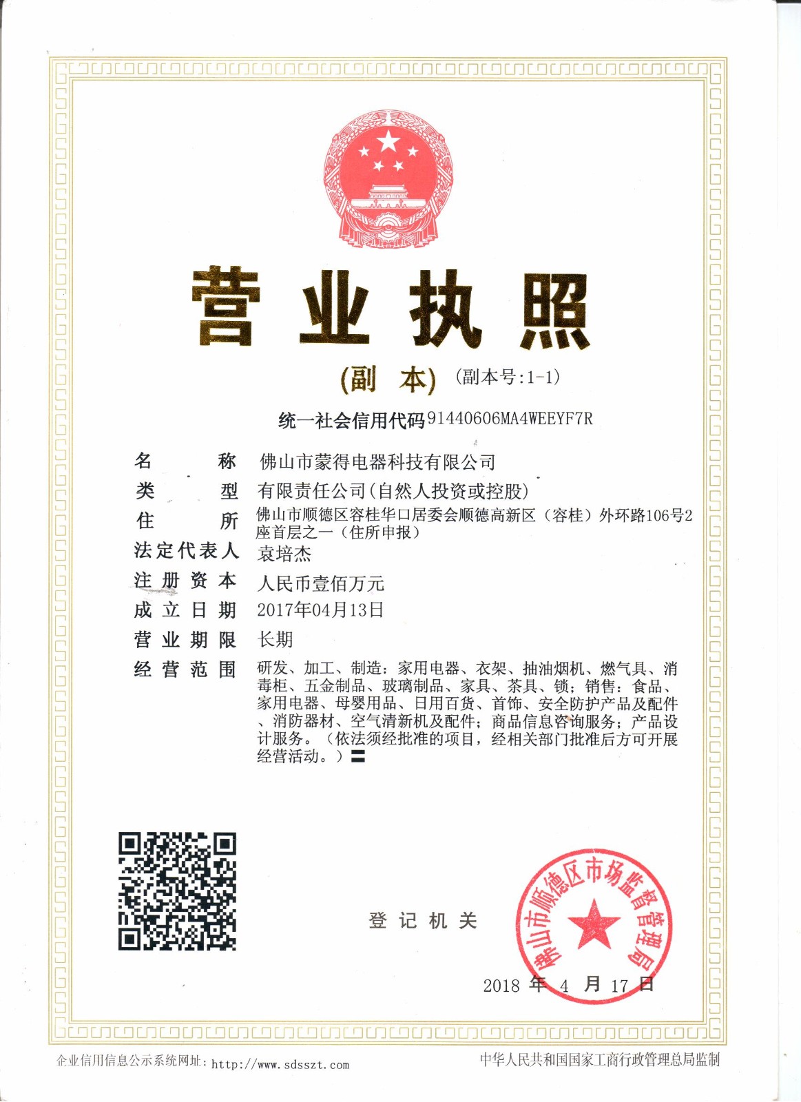 - 經營范圍:研發、加工、制造:家用電器、衣架、抽油煙機、燃氣具、消毒柜、五金制品、玻璃制品、家具、茶具、鎖:銷售:食品、家用電器、母嬰用品、日用百貨、首飾、安全防護產品及配件、消防器材、空氣清新機及配件:商品信息咨詢服務:產品設計服務。(依法須經批準的項目,經相關部門批準后方可開展經營活動)