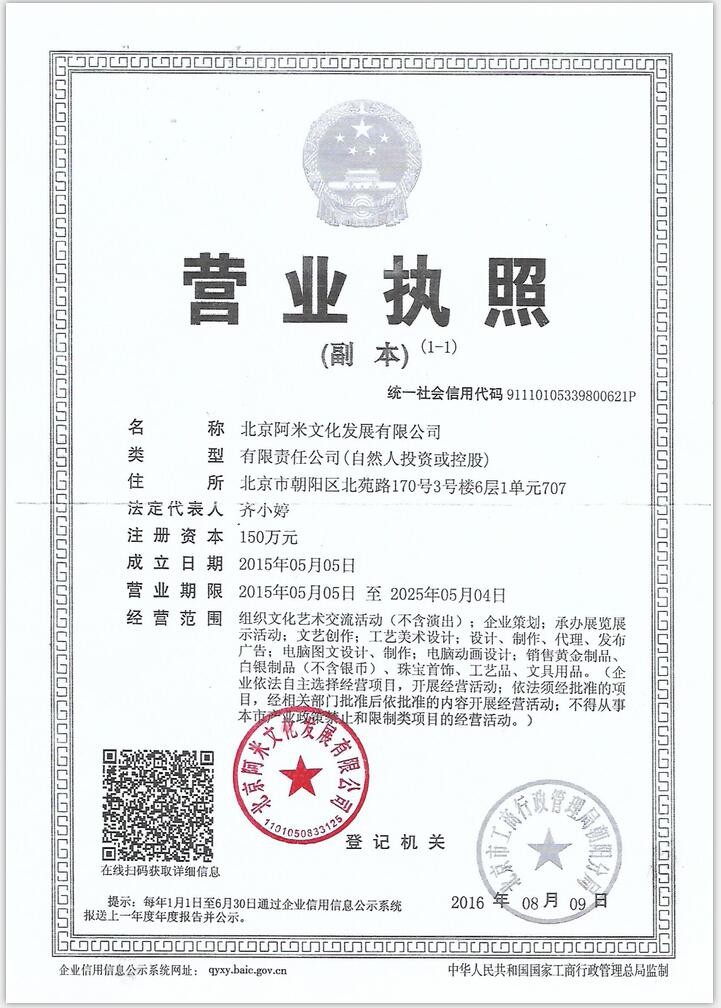 - 經(jīng)營范圍:組織文化藝術(shù)交流活動(不含演出);企業(yè)策劃;承辦展覽展示活動;文藝創(chuàng)作;工藝美術(shù)設(shè)計;設(shè)計、制作、代理、發(fā)布廣告;電腦圖文設(shè)計、制作;電腦動畫設(shè)計;銷售黃金制品、白銀制品(不含銀幣)、珠寶首飾、工藝品、文具用品。(企業(yè)依法自主選擇經(jīng)營項目,開展經(jīng)營活動;依法須經(jīng)批準的項目,經(jīng)相關(guān)部門批準后依批準的內(nèi)容開展經(jīng)營活動;不得從事本市產(chǎn)業(yè)政策禁止和限制類項目的經(jīng)營活動。)