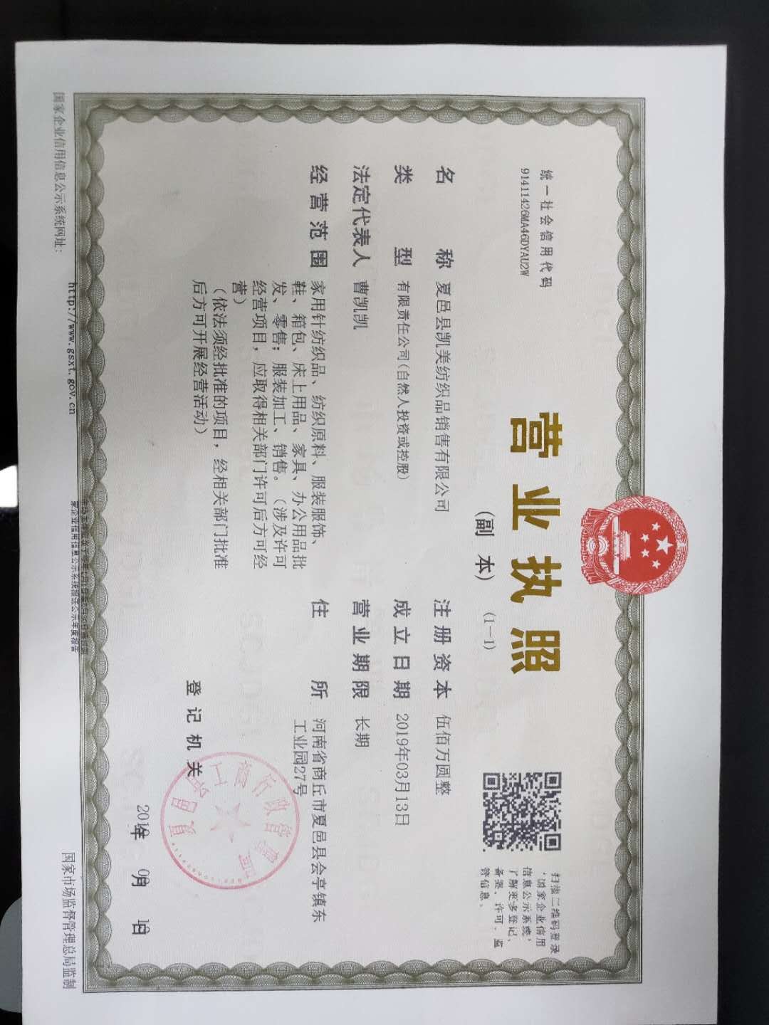 - 經營范圍:家用針紡織品、紡織原料、服裝服飾、鞋、箱包、床上用品、家具、辦公用品批發、零售;服裝加工、銷售。
