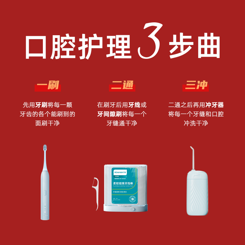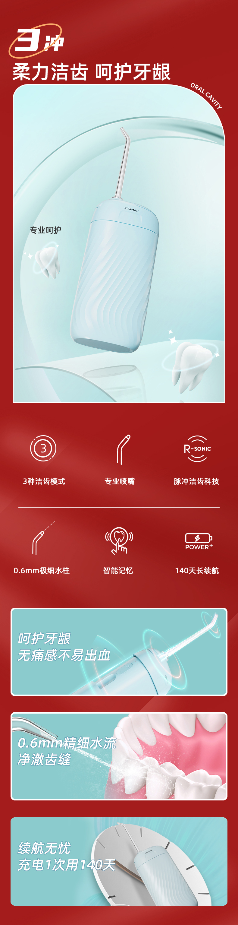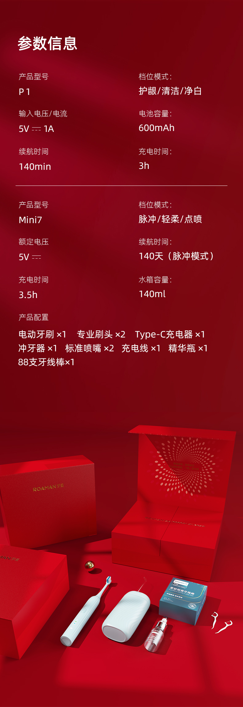 1、一刷二通三沖,適應各類人群口腔需求 2、采用杜邦刷毛,潔力提升30%,清潔深處污垢 3、31000-41000次/分鐘聲波震動可調 4、1600次/分高頻脈沖,0.6mm細膩水柱 5、采用FDA食品級材質,自動計時功能,口腔更健康 6、IPX7級全身水洗,可淋浴 7、Type-c快充 /便攜式磁吸快充,提供超長續航體驗 8、一站式配備自動盒牙線棒及口腔清新精華 9、根據不同場景及節日可定制專屬腰封