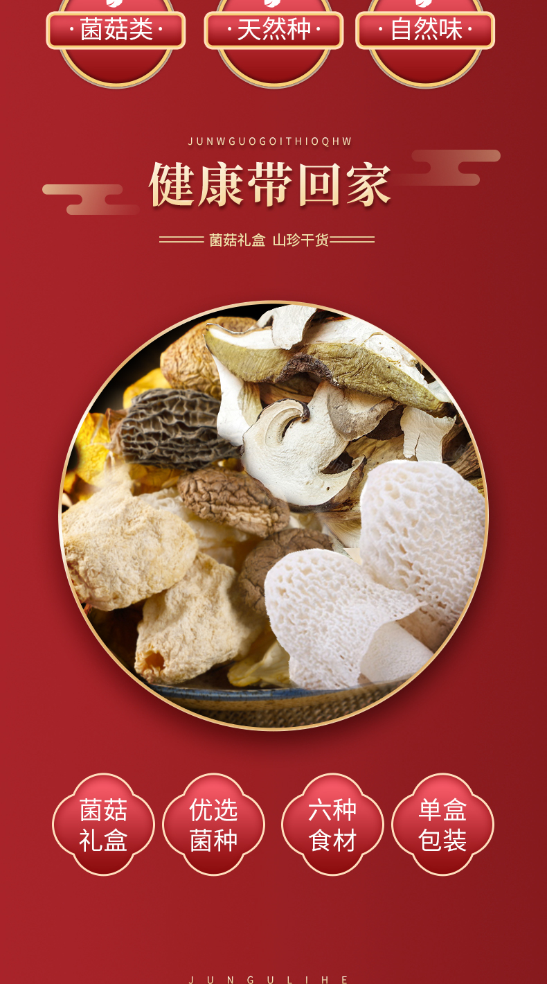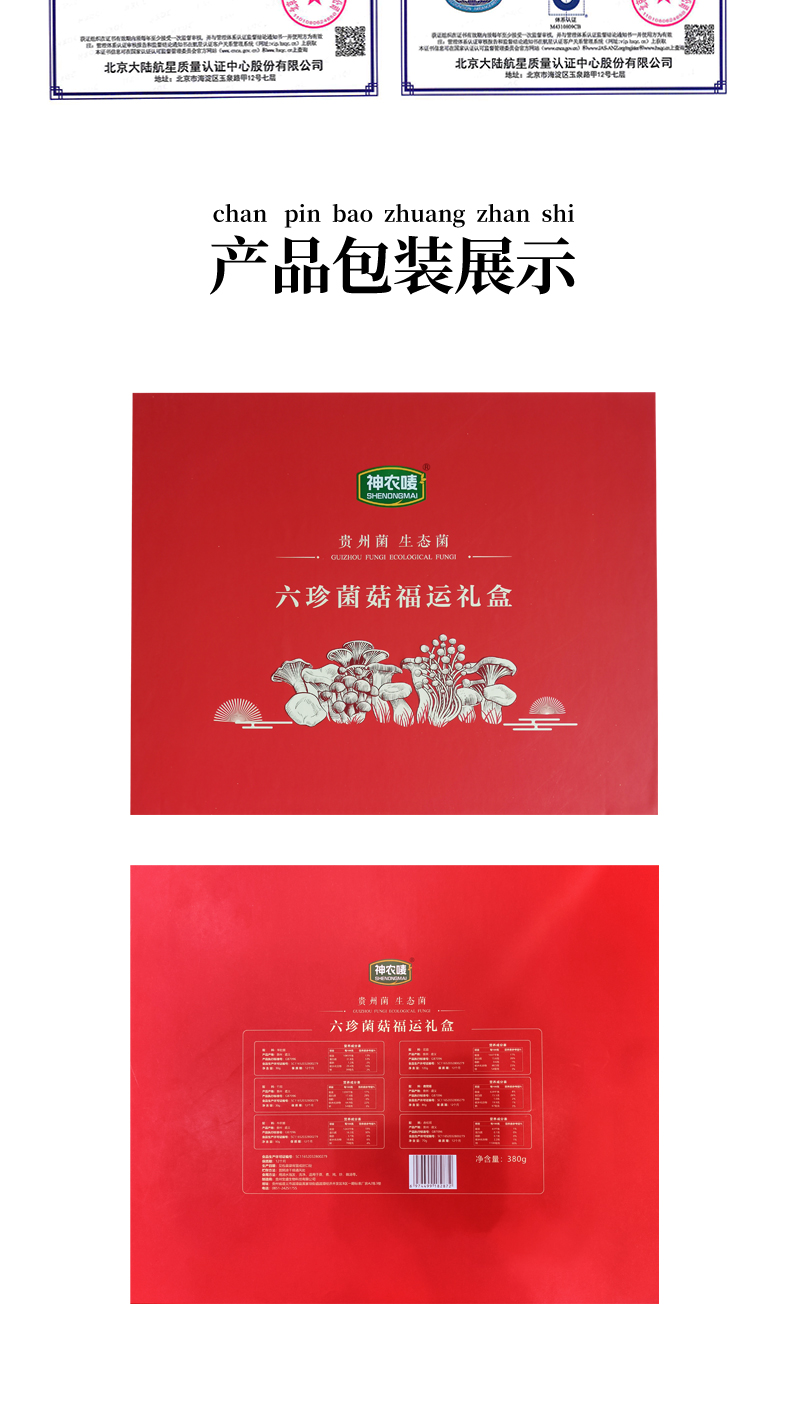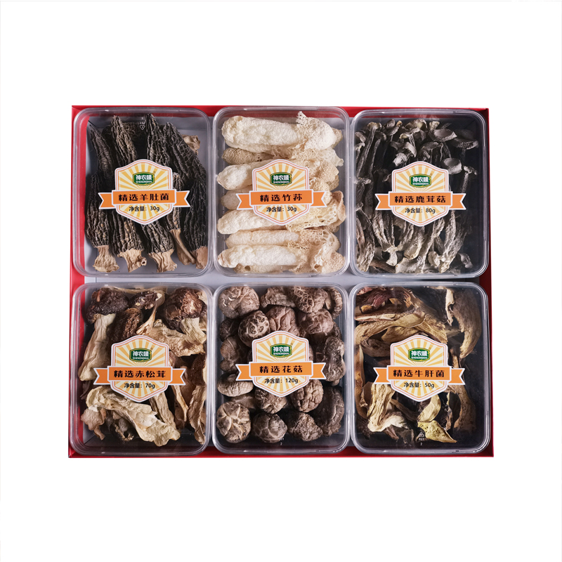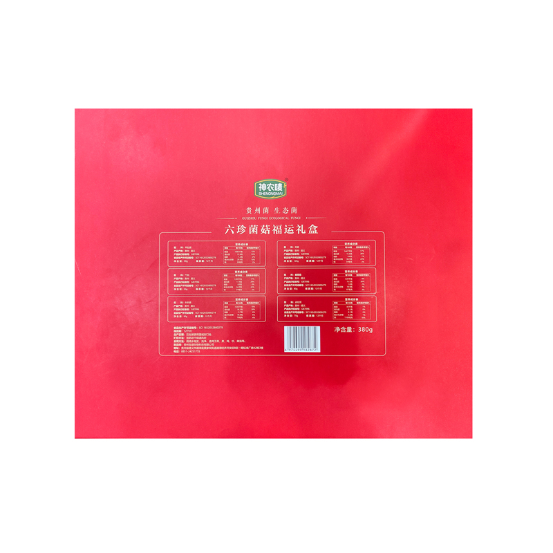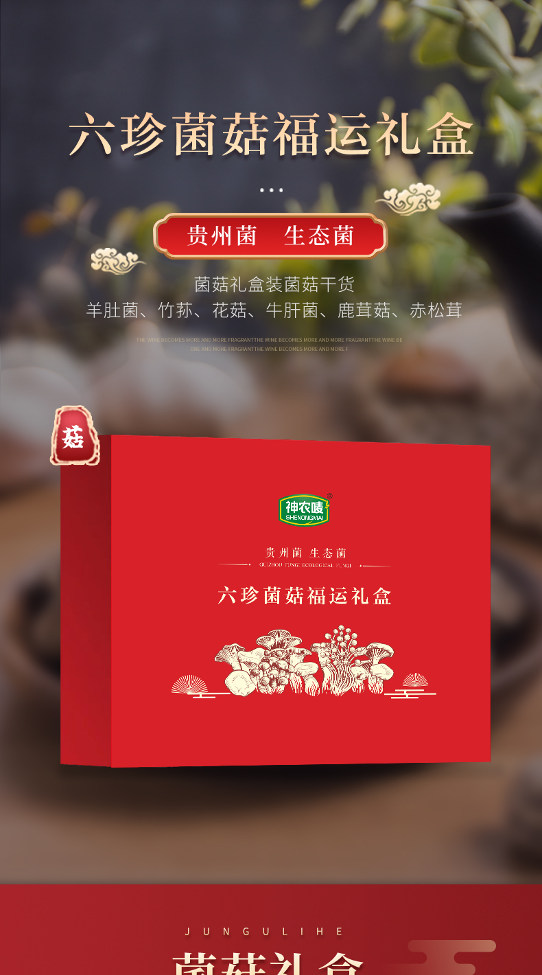 貴州精選菌菇禮盒、禮盒內(nèi)容物(羊肚菌30g,竹蓀30g,牛肝菌50g,花菇120g,鹿茸菇80g,赤松茸70g)紅色大氣手提禮盒裝、送禮更體面
