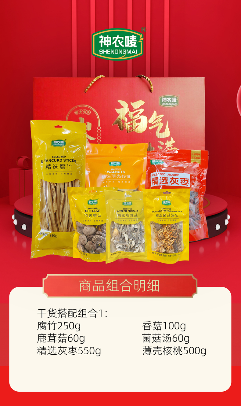 菌菇干果禮盒、禮盒內容物:(腐竹250g、香菇100g、鹿茸菇60g、菌菇湯60g、精選灰棗550g、薄殼核桃500g) 節日送禮禮盒