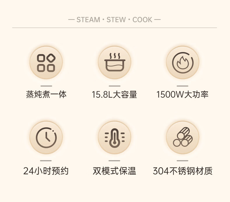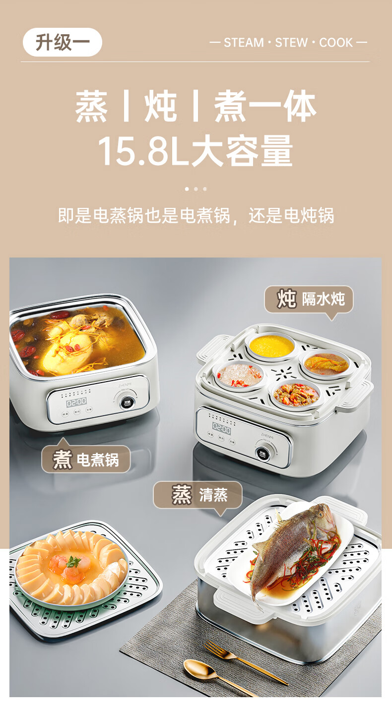 全新升級(jí),15.8L大容量,蒸|燉|煮一體