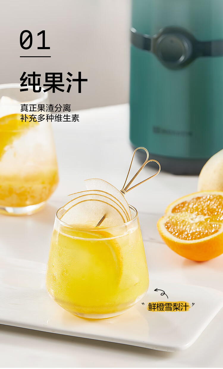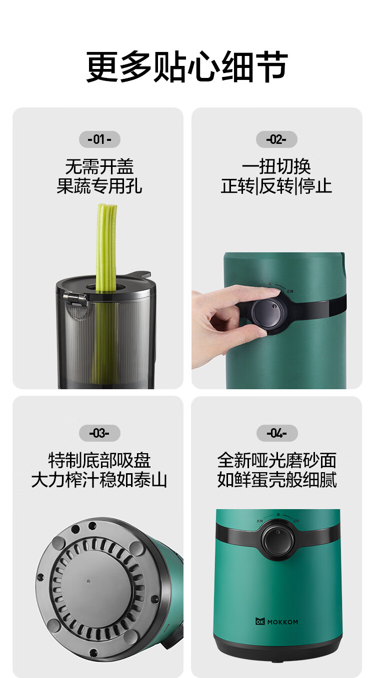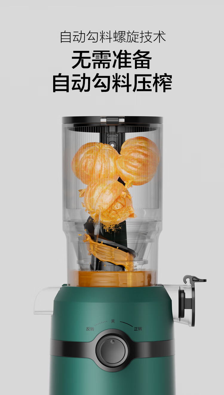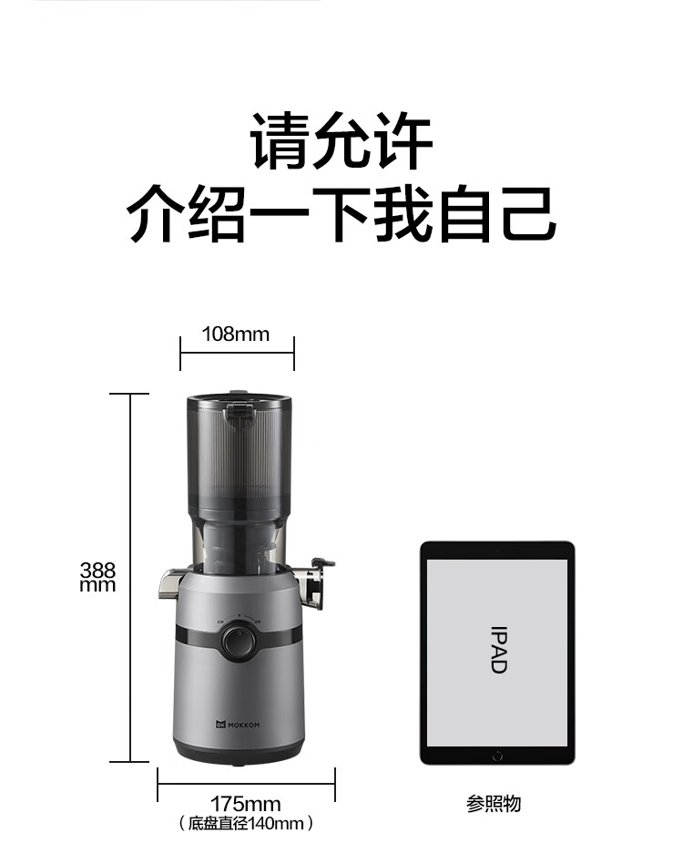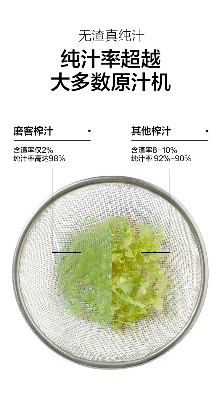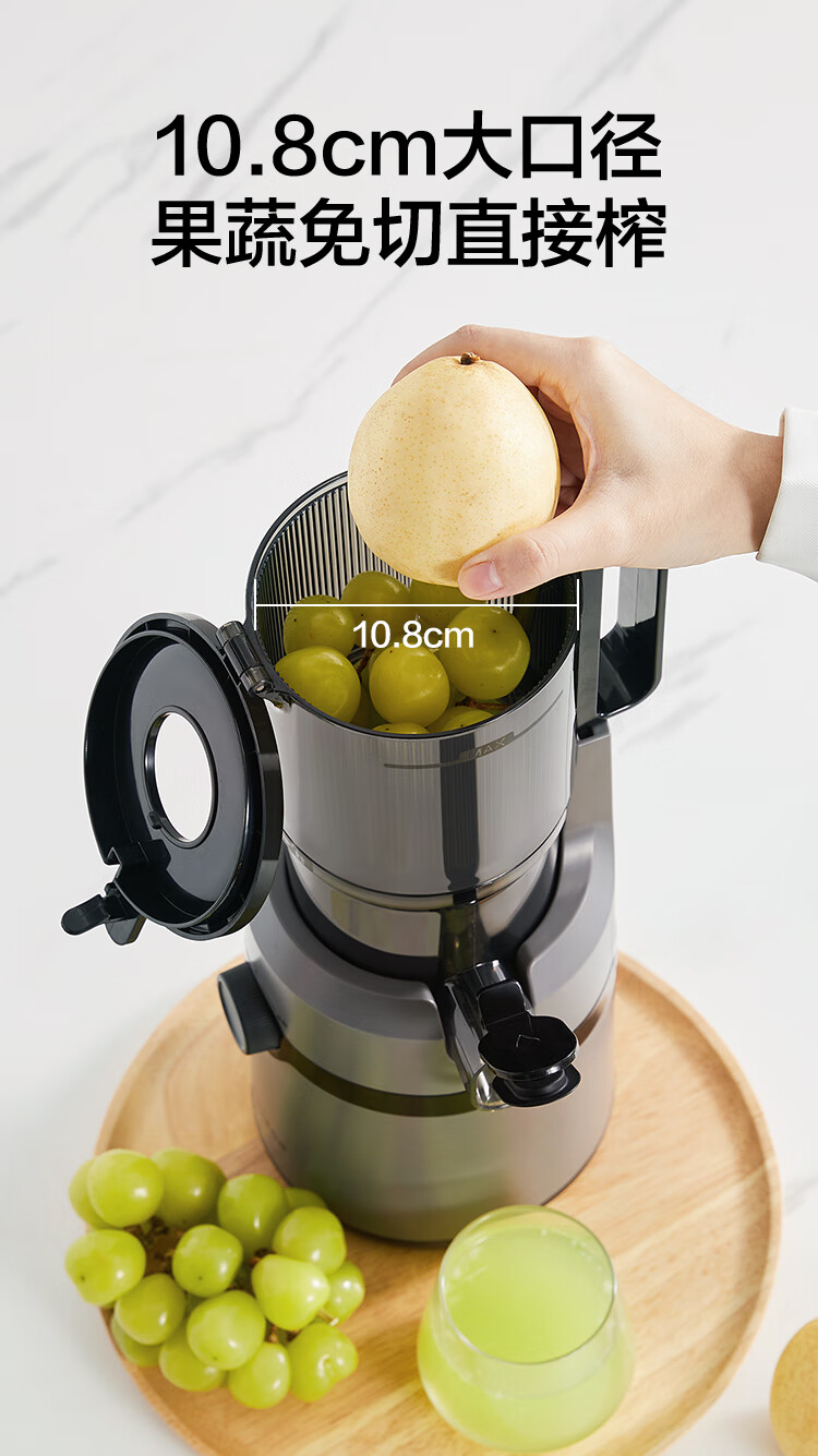 10.8cm大口徑,1L大容量料桶,可以一次榨更多水果,不用切,整顆榨,大塊投放真方便,不切小塊防氧化又安全