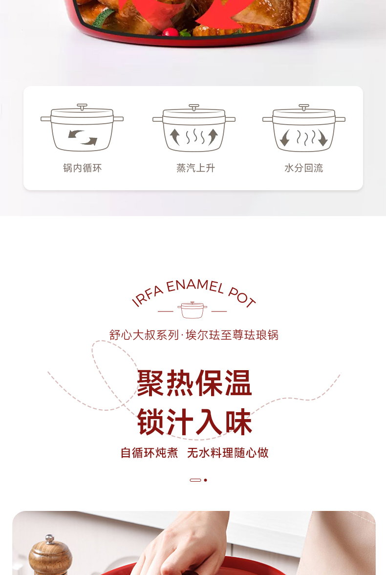 埃爾法至尊琺瑯鍋大容量雙色可選,滿足家庭日常所需,聚熱保溫鍋內(nèi)水分自循環(huán),一鍋多用,不挑爐灶,不粘易清洗,微壓烹飪,直徑約24cm,高度約18cm,精鐵材質(zhì),2.5kg