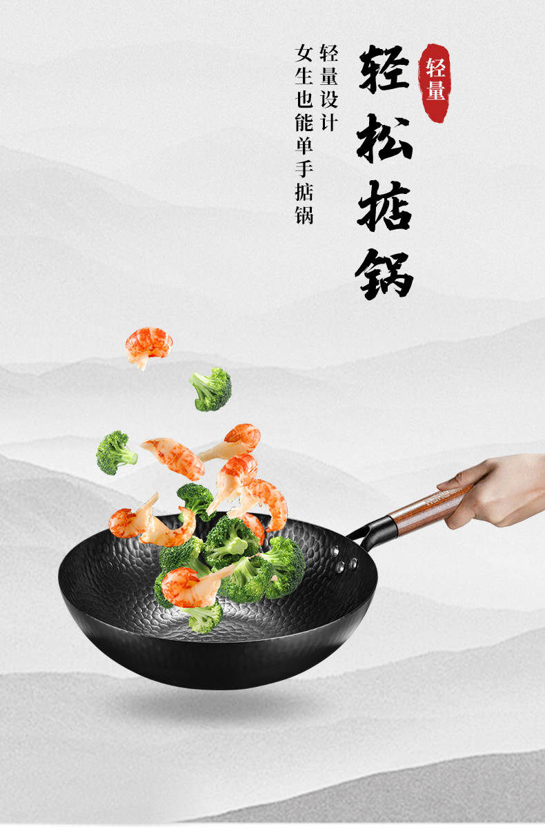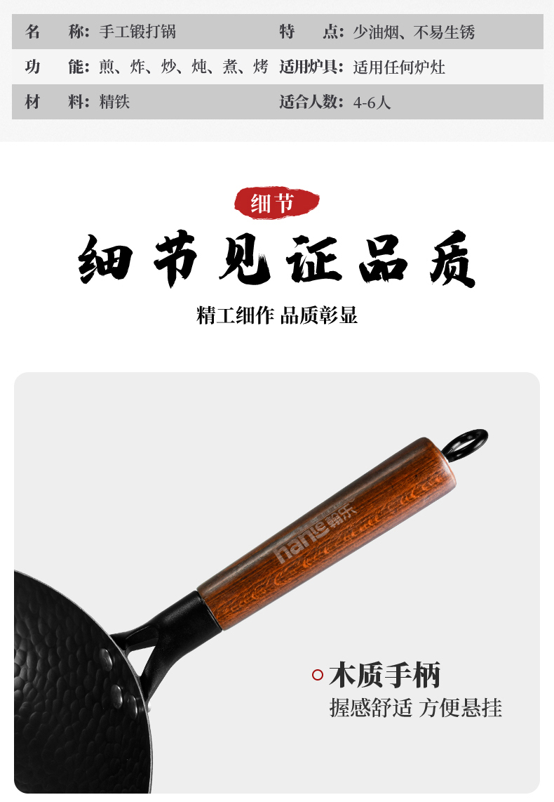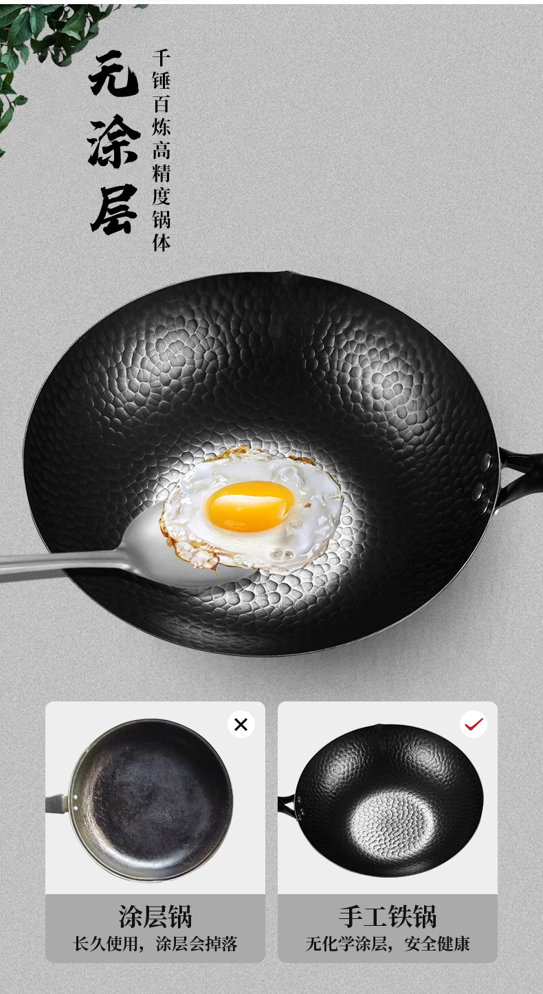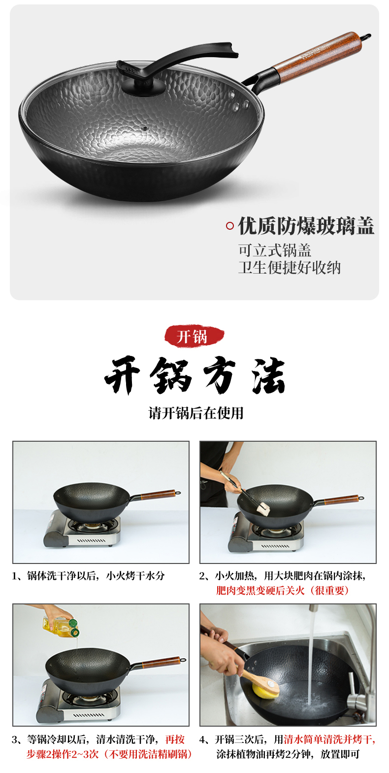 1.舌尖上的中國同款章丘手打鍋 2.鑄鐵無涂層更健康,可用鐵鏟、耐磨、不易粘鍋 3.章丘鍛打工藝少煙,防銹 4.櫸木手柄 不累手 暢享烹飪樂趣
