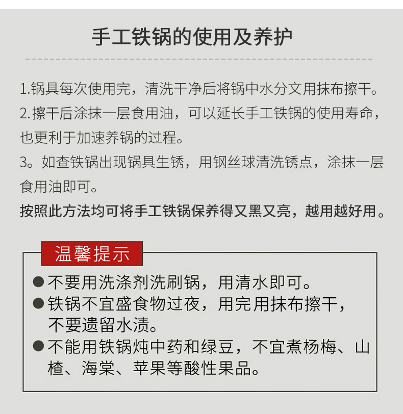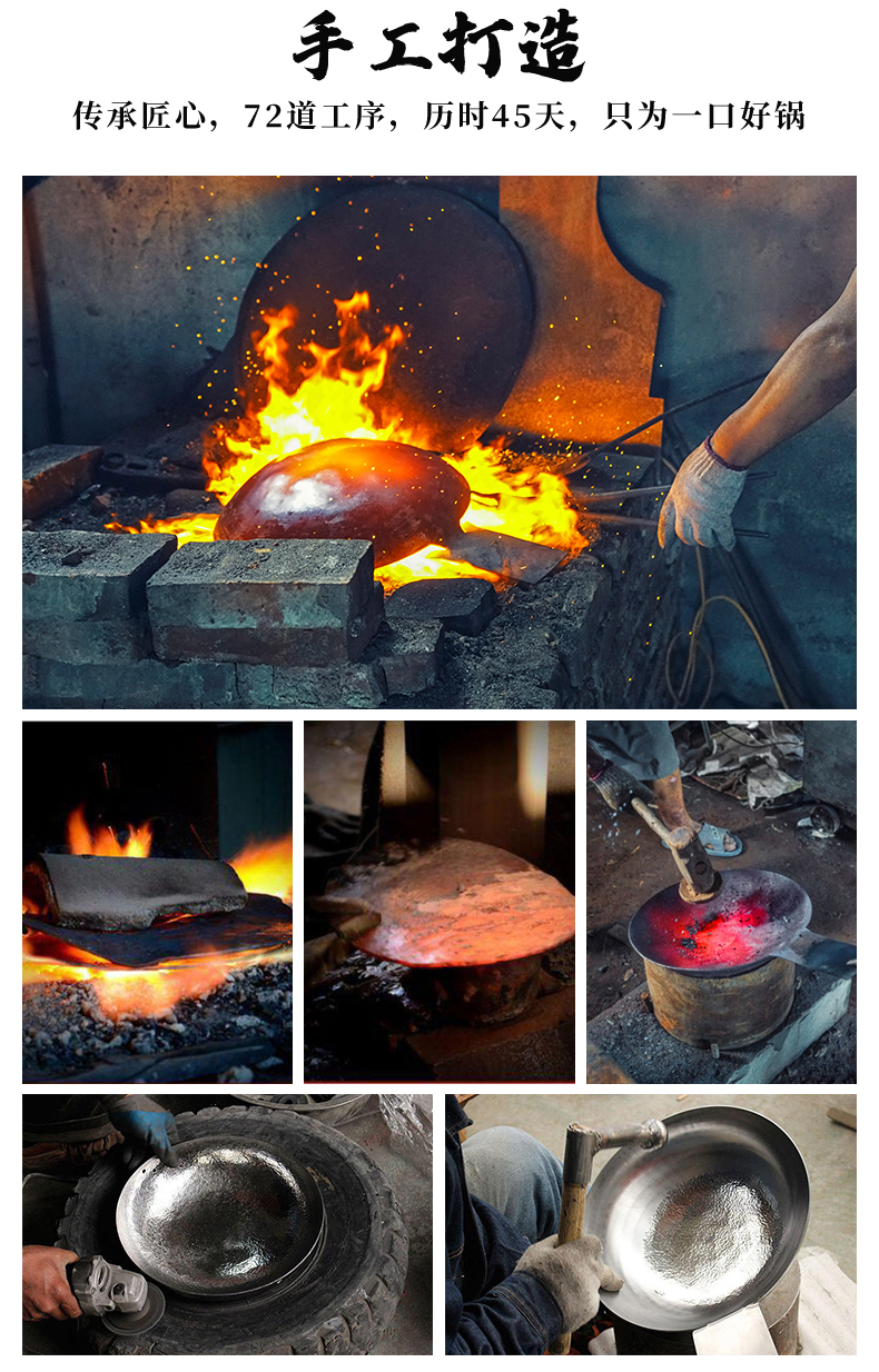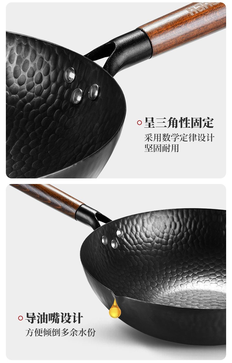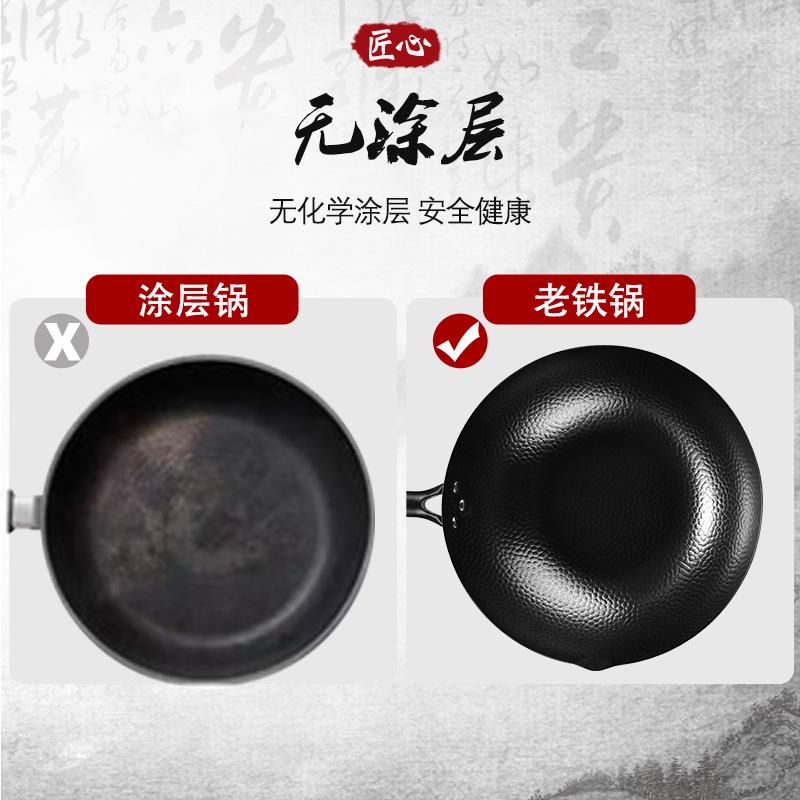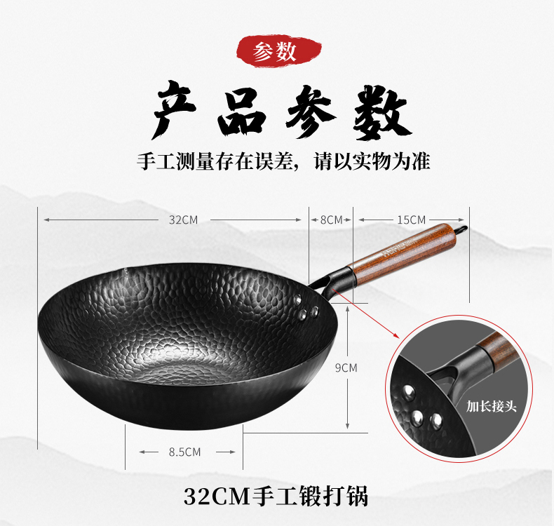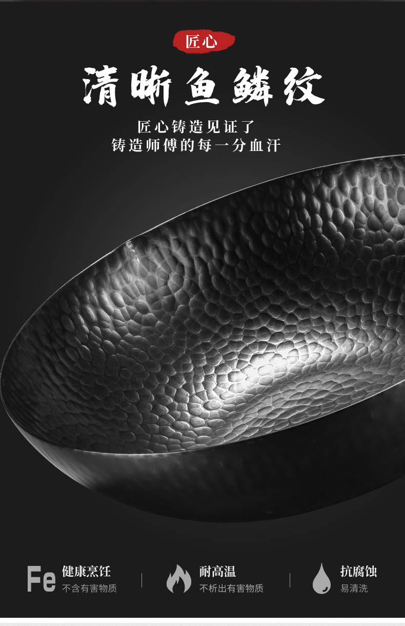 1.舌尖上的中國同款章丘手打鍋 2.鑄鐵無涂層更健康,可用鐵鏟、耐磨、不易粘鍋 3.章丘鍛打工藝少煙,防銹 4.櫸木手柄 不累手 暢享烹飪樂趣