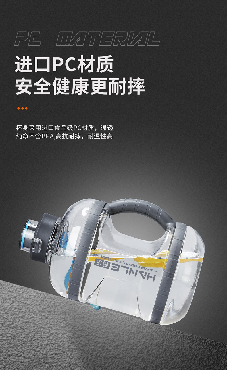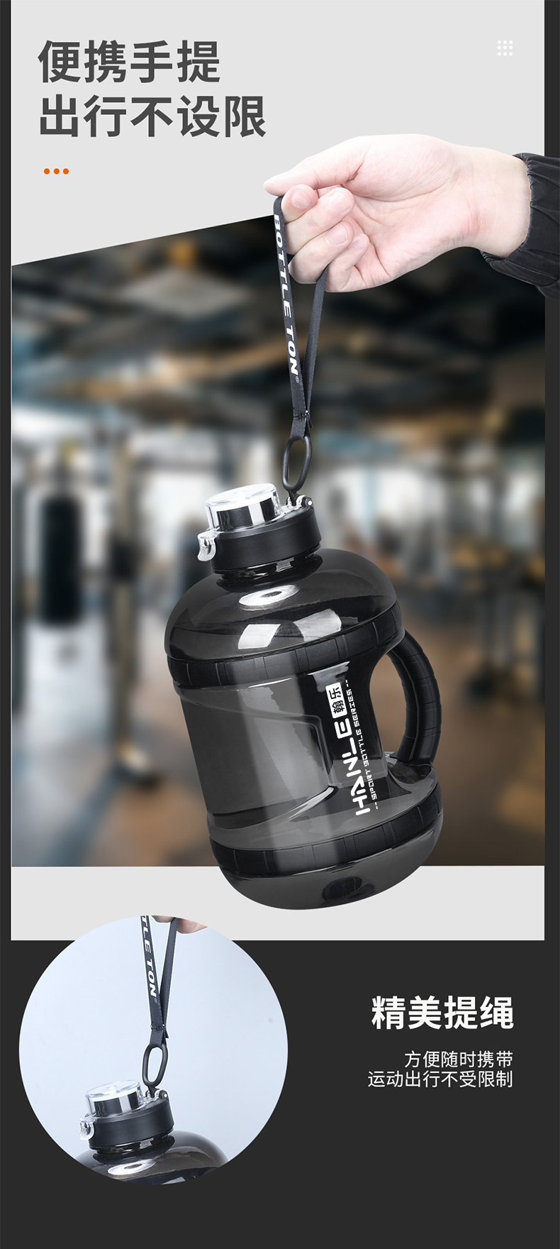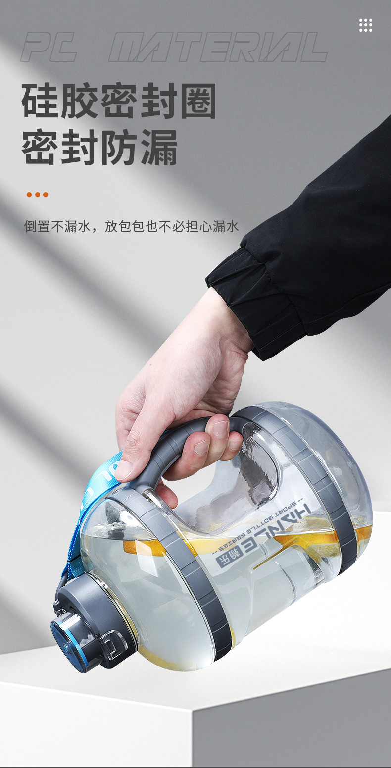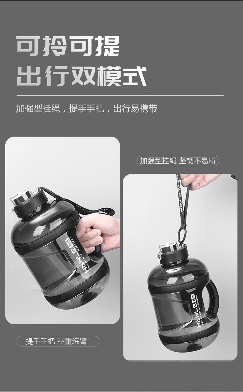 健身網(wǎng)紅大容量運動杯,運動出行,便攜可拎可手提,加強型掛繩,硅膠圈密封,密封防漏,超大容量滿足一天飲水量,杯身采用進口食品級PC材質(zhì),通透純凈不含BPA,高抗耐摔,耐溫性高,一通水量約等于500ml礦泉水5瓶,2300ml,25cm*15cm,兩種飲水方式,小口慢飲,大口暢飲