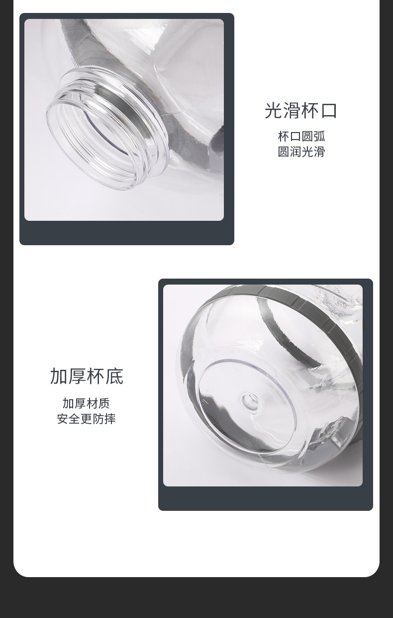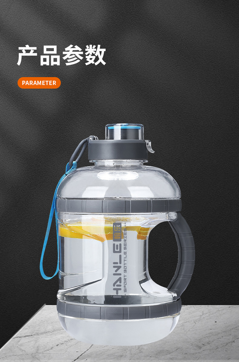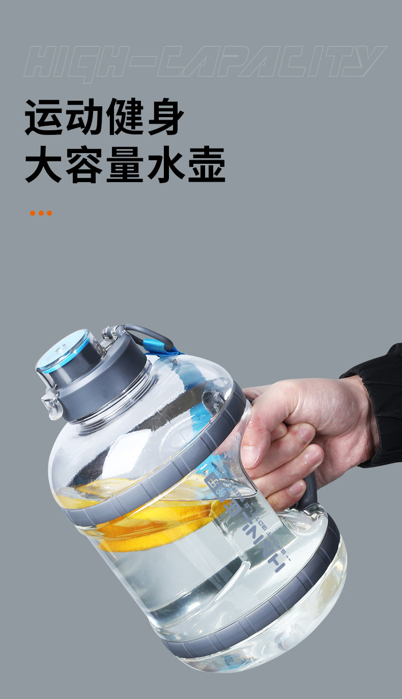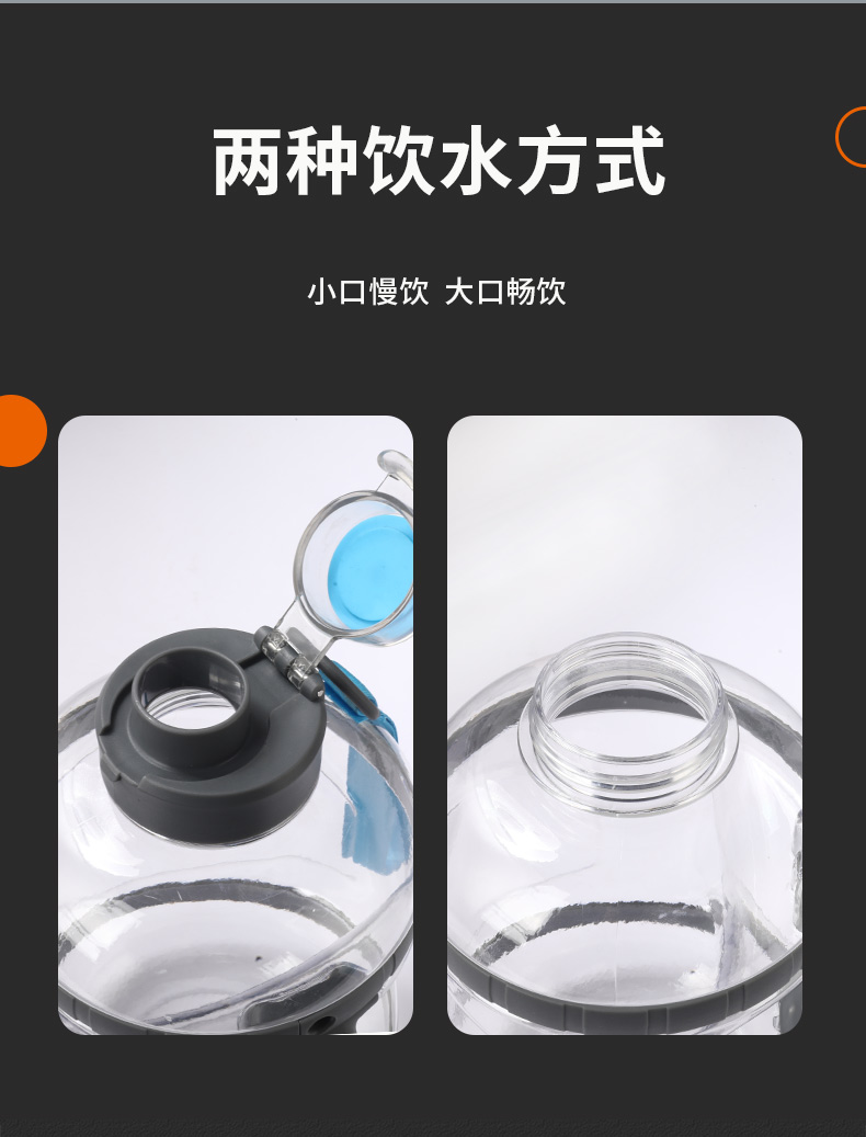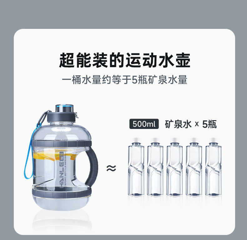 健身網(wǎng)紅大容量運動杯,運動出行,便攜可拎可手提,加強型掛繩,硅膠圈密封,密封防漏,超大容量滿足一天飲水量,杯身采用進口食品級PC材質(zhì),通透純凈不含BPA,高抗耐摔,耐溫性高,一通水量約等于500ml礦泉水5瓶,2300ml,25cm*15cm,兩種飲水方式,小口慢飲,大口暢飲