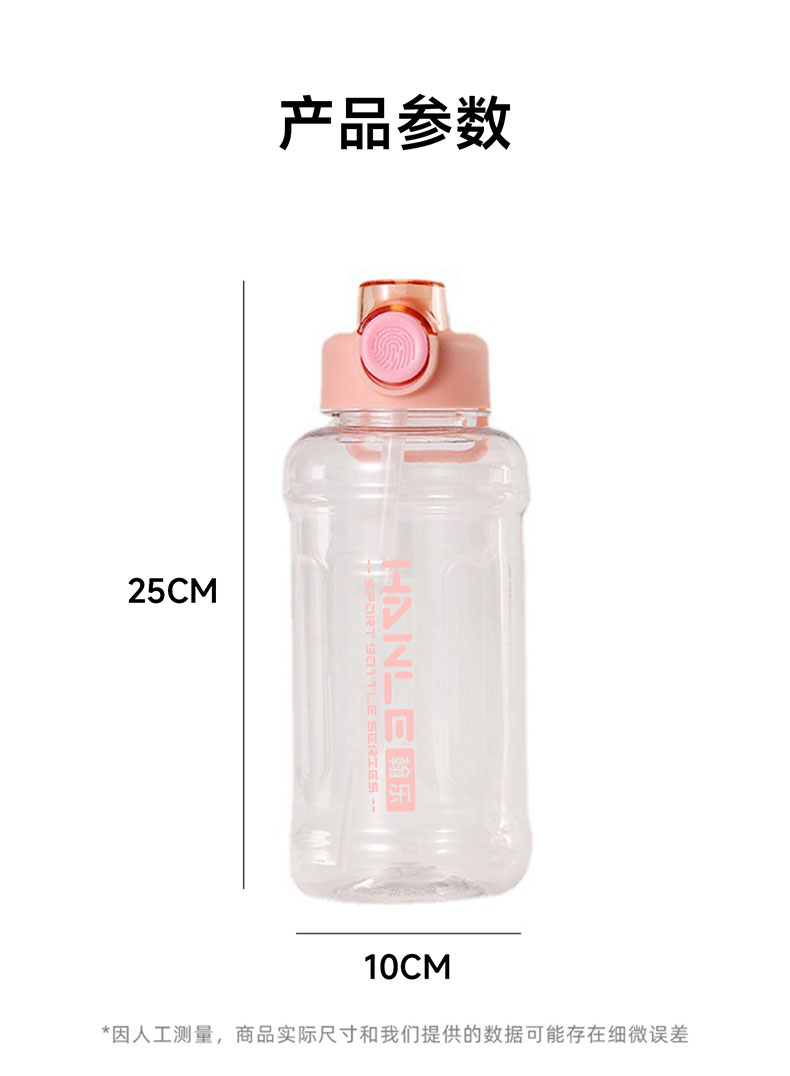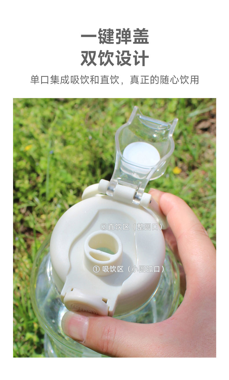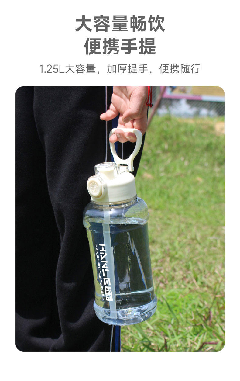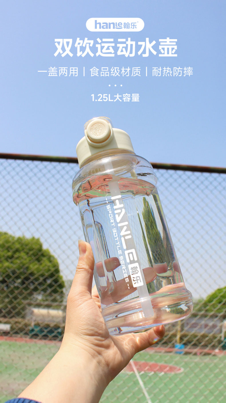 雙飲運動水壺,簡約時尚,運動隨行,1.25L大容量,一蓋兩用,密封防漏,耐熱防摔,杯身凹凸紋設計,更易抓握,一鍵彈蓋,單口集成吸飲和直飲,食品級PC(杯體)食品級PP(杯蓋、吸管)食品級硅膠(密封圈),加厚提手,手提更舒適,約10cm*25cm