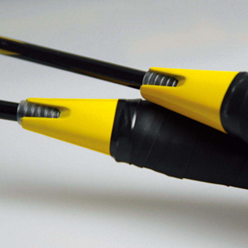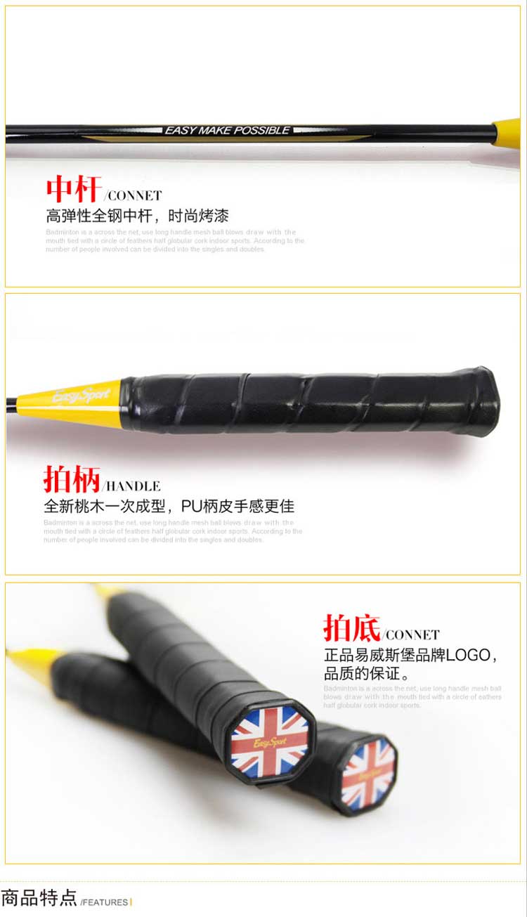 鋁框鋼桿,減少了球拍的重 量,柄處 的減震裝置能有效減弱扣殺時球拍對虎口的壓力,節(jié)省 體力