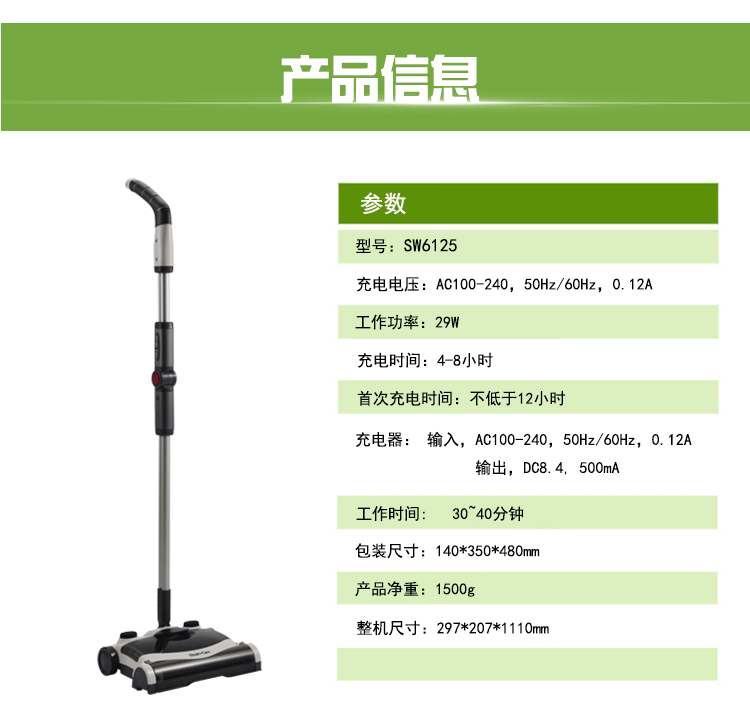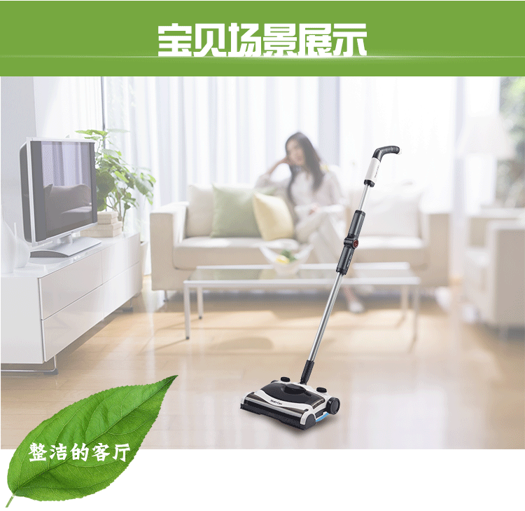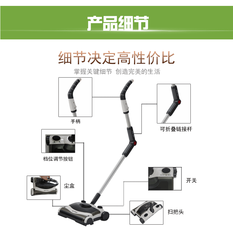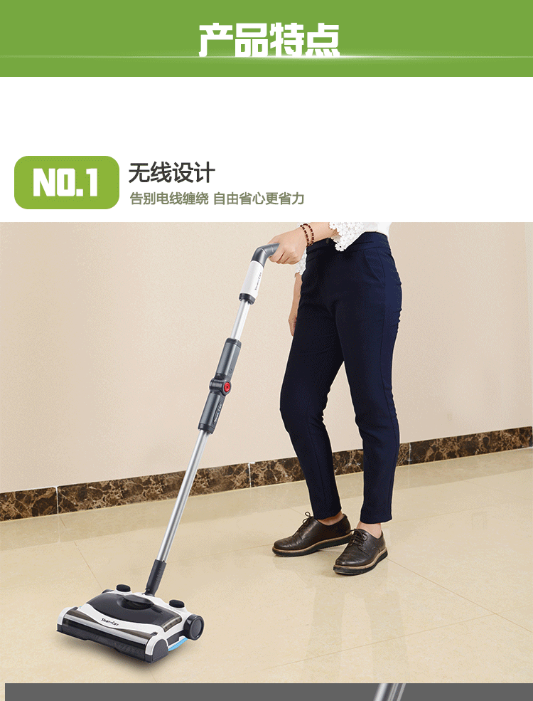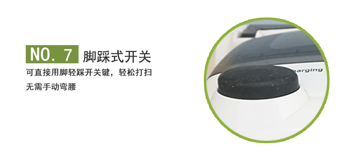 清潔好拍檔 掃地不彎腰,電動清掃不費力,使用方便輕巧,腳踩開關啟動,輕松清空塵盒。