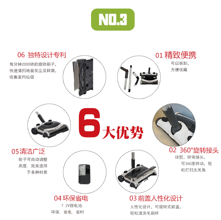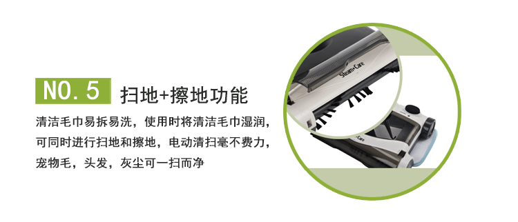 • 5.每分鐘2000轉的旋轉刷子,從前向后清掃地面灰塵及碎屑,收集室內垃圾。