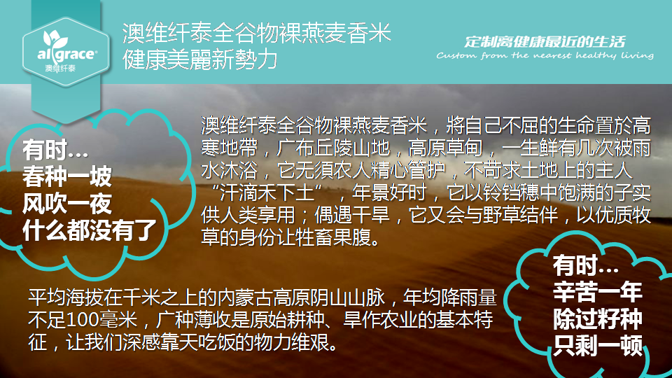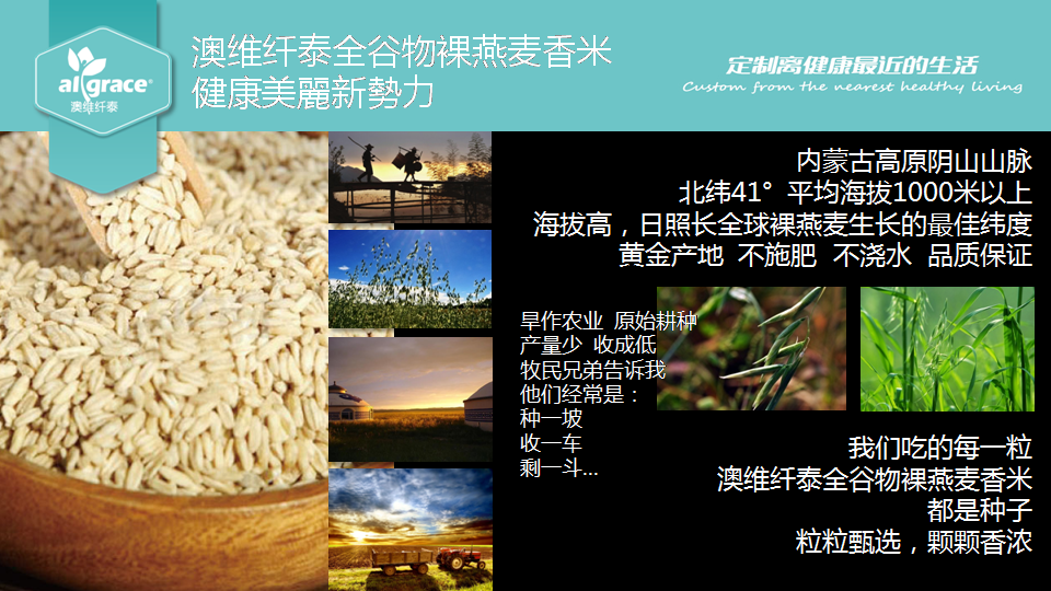 澳維纖泰裸燕麥香米生長在北緯41°,海拔1000米以上,沒有受到工業(yè)污染的中國西部內(nèi)蒙古高原地帶。生長過程堅持有機(jī)栽培的耕種方式。