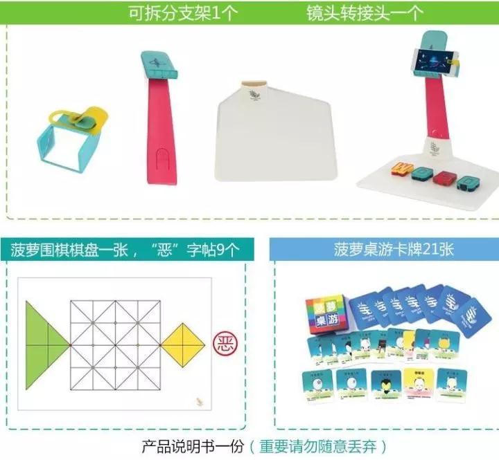 26個(gè)可變型的字母+角色盒子;一個(gè)專利可拆分支架;一個(gè)鏡頭轉(zhuǎn)接頭;一副識(shí)詞卡片(98張);一副AR發(fā)現(xiàn)體驗(yàn)卡片(34張);一張菠蘿圍棋盤;菠蘿桌游卡牌(21張); 一個(gè)收納袋;一本說明書