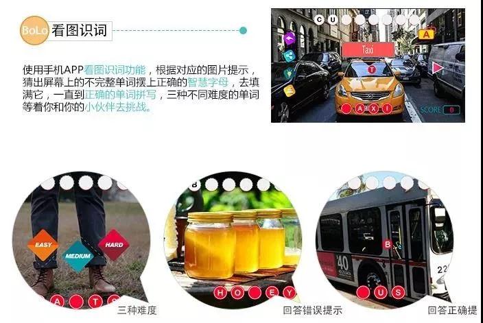 2、【看圖識(shí)詞】:根據(jù)屏幕上的圖片,猜出屏幕上不完整的單詞,將對(duì)應(yīng)的菠蘿字母擺放在操作臺(tái)上,APP將自動(dòng)識(shí)別并判斷它們是否正確,有三種難度供孩子們挑戰(zhàn)。