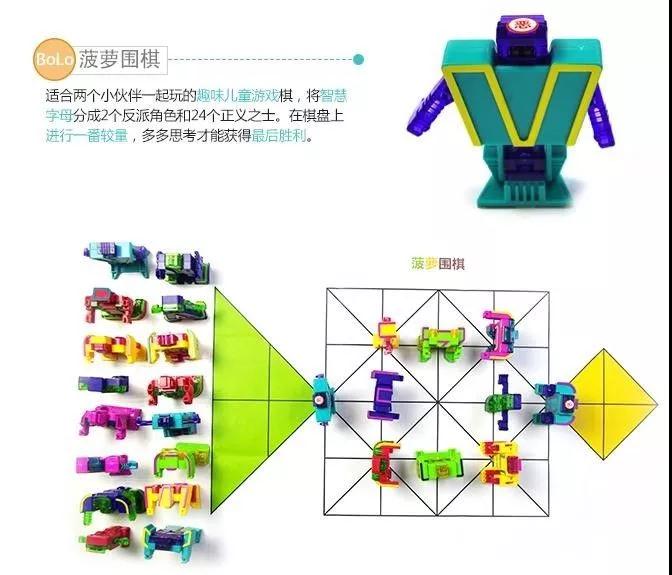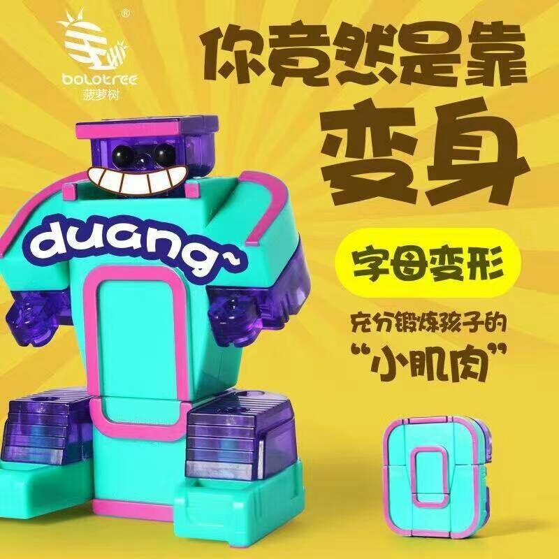 1、【字母變形】:26個(gè)菠蘿字母都可以露出小腦袋,張開小胳膊,伸出小短腿,從字母形態(tài)變身成為字母機(jī)器人,英雄決斗,排兵布陣,盡情的展示小朋友的各種創(chuàng)意。通過擰和拔等簡(jiǎn)單的動(dòng)作讓孩子的手指小肌肉得到鍛煉,菠蘿字母的自由變身和擺放組合可以激發(fā)孩子的無(wú)限的想象力。