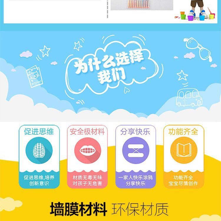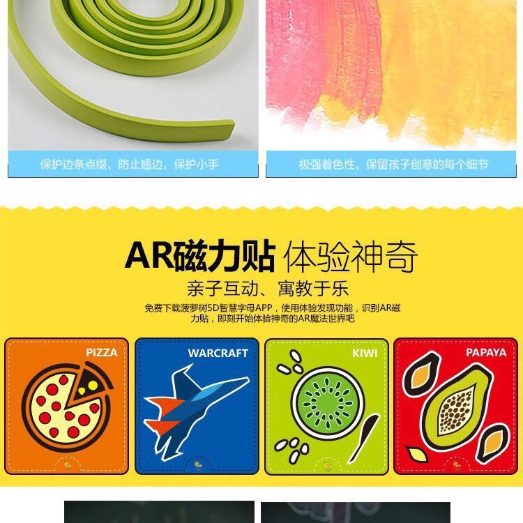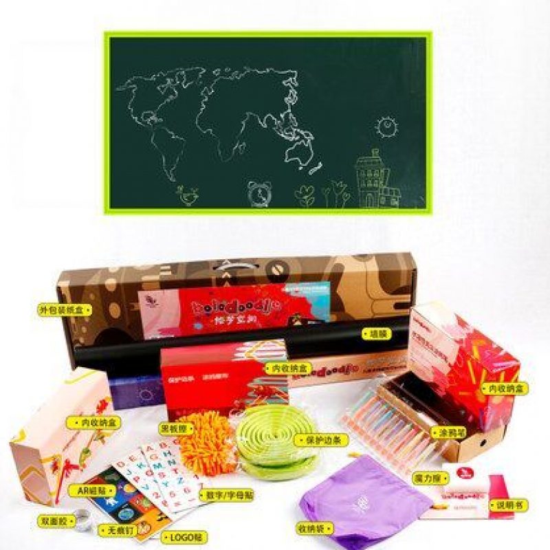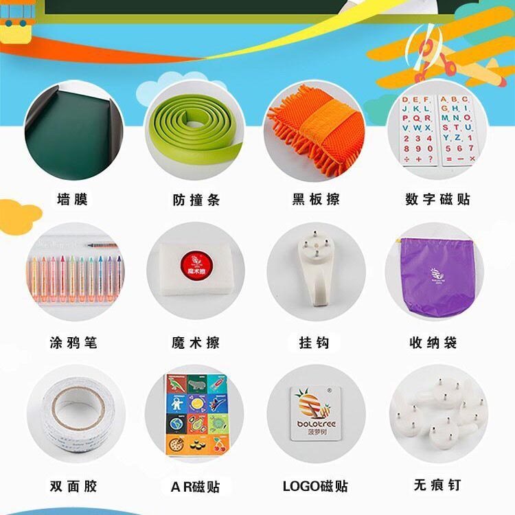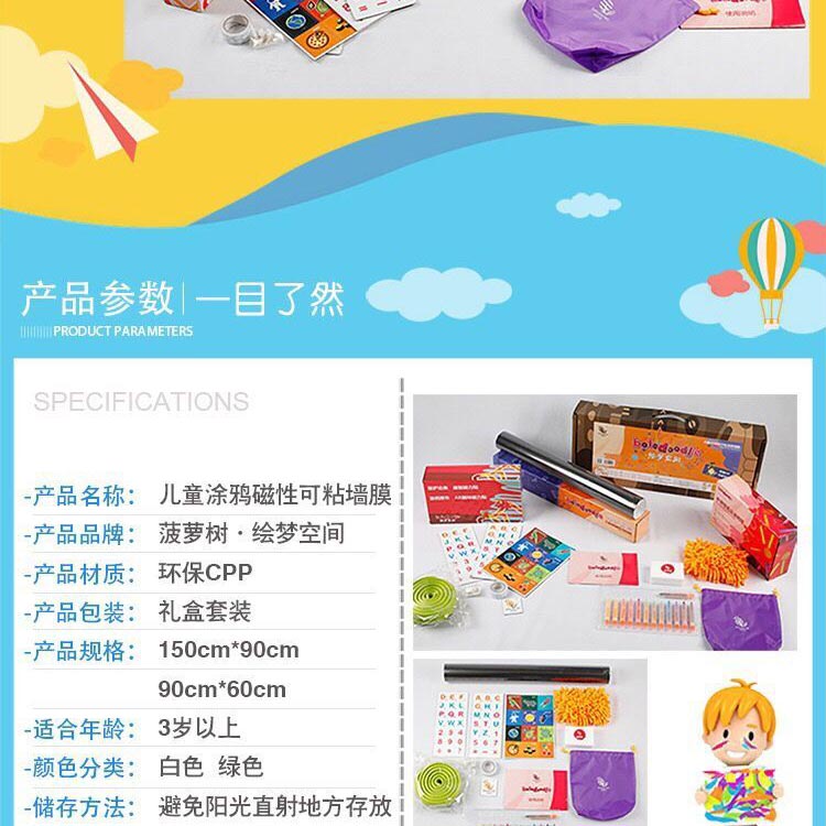 菠蘿樹涂鴉墻膜,進口環(huán)保塑膠,表層磨砂處理,不反光,國際標準護眼綠色,多種尺寸供選擇。可用10年,不脫落,不翹邊。含13色食品級可擦洗涂鴉筆禮盒裝,無揮發(fā),無異味,無粉塵,同時配防撞裝飾邊條;高級雪妮絨抹布等; 打造寶寶專屬的涂鴉學習空間!