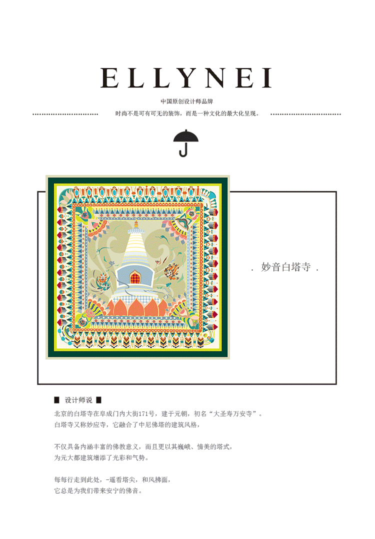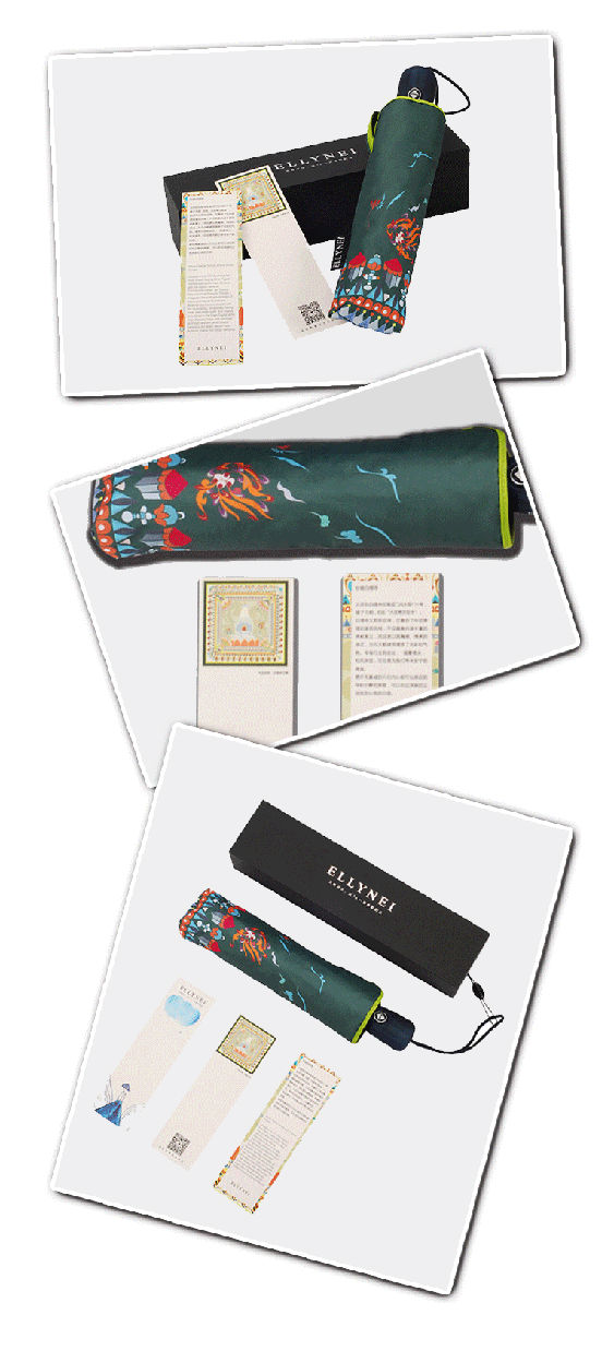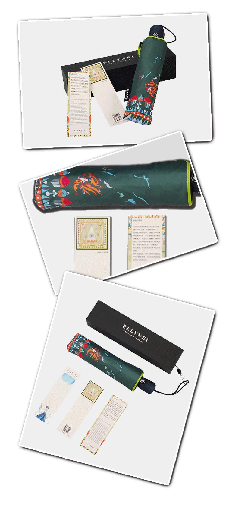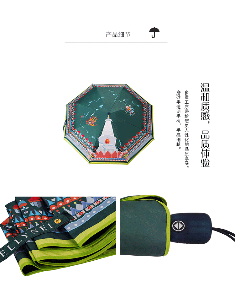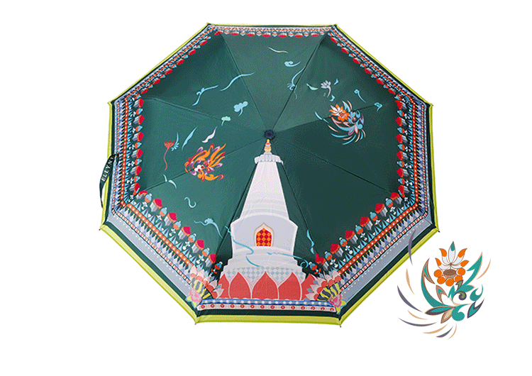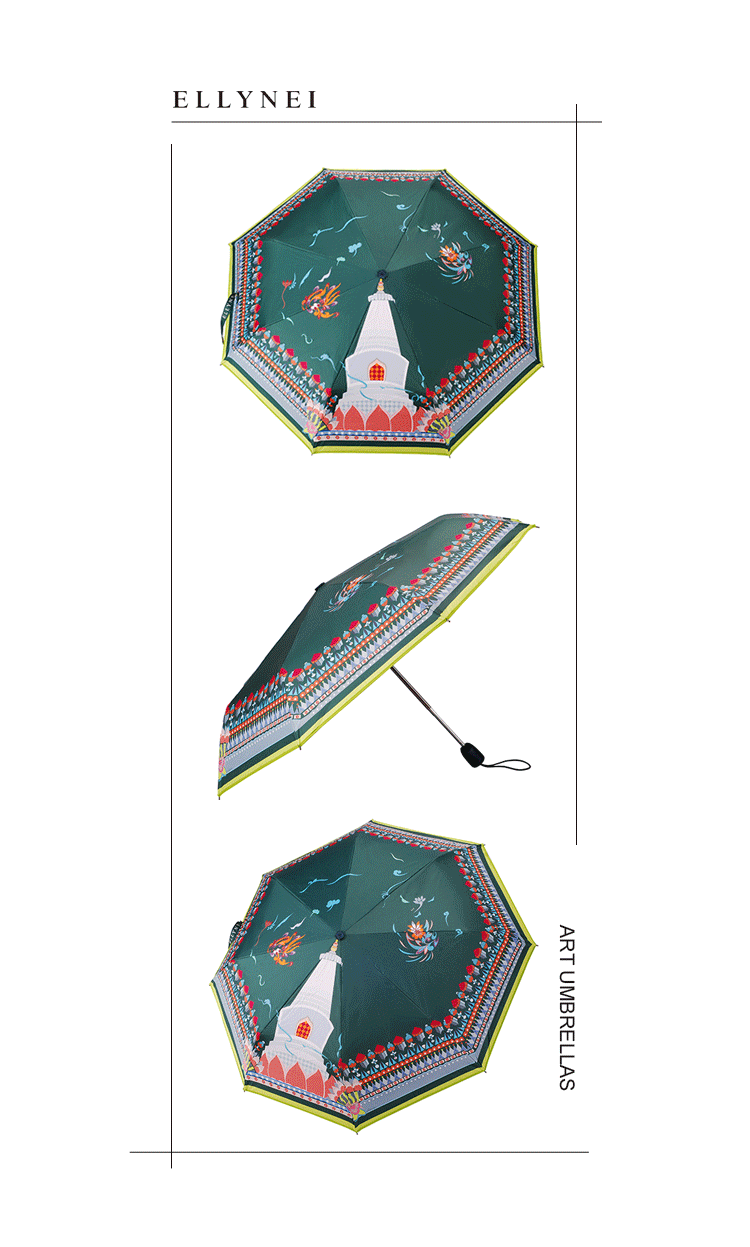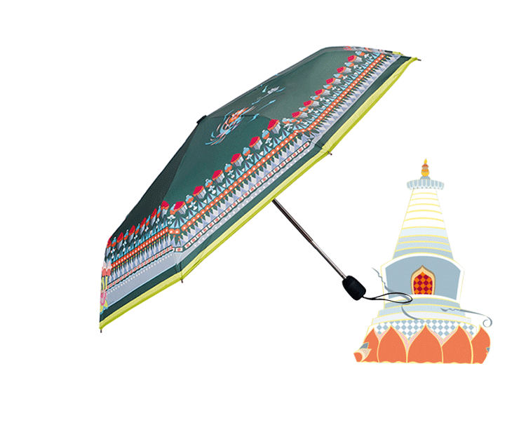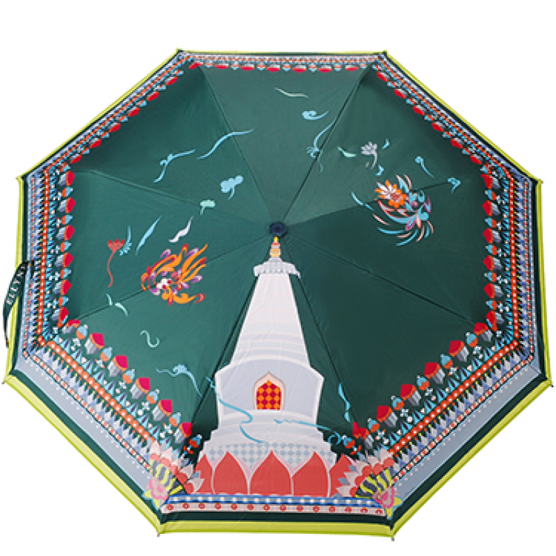 淺綠色款 此款雨傘以淺綠色為主,運用同類色墨綠色進行豐富, 運用橙色系進行對比,再現白塔寺寧靜幽美的意境。