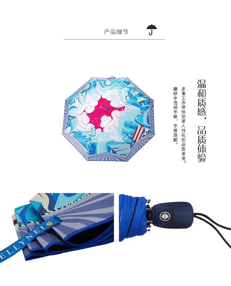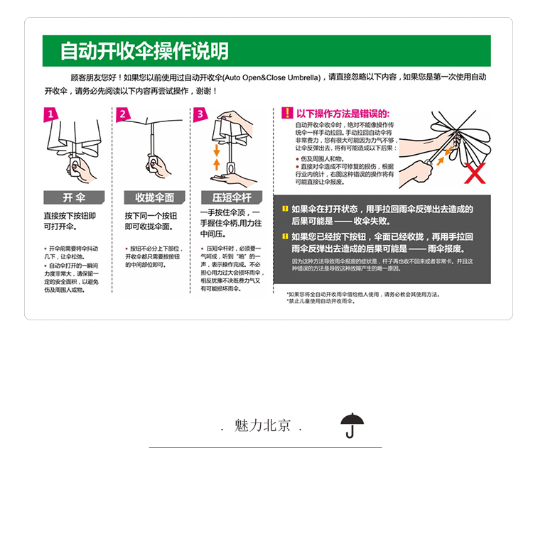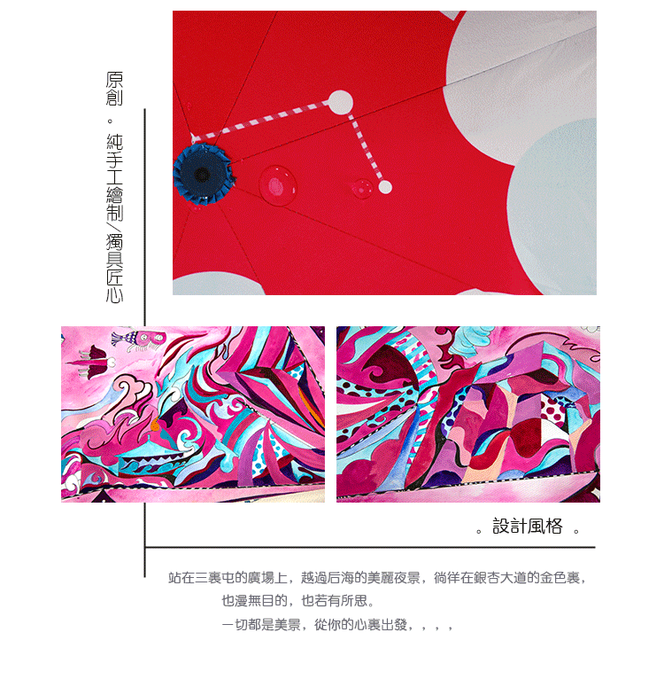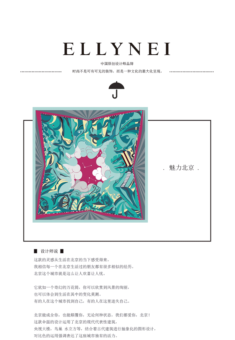 這款雨傘的靈感從生活在北京的當(dāng)下感受得來,我相信每一個(gè)在北京生活過的朋友都有很多相似的經(jīng)歷。北京這個(gè)城市就是這么讓人歡喜讓人憂。它猶如一個(gè)奇幻的萬花筒,你可以欣賞到風(fēng)景的絢麗,也可以體會(huì)到生活在其中的變化莫測。有的人在這個(gè)城市找到自己,有的人在這里迷失自己。北京能成全你,也能顛覆你,無論何種狀態(tài),我們都愛你,北京!