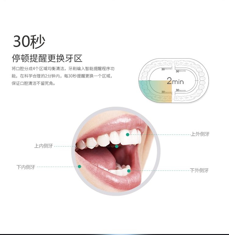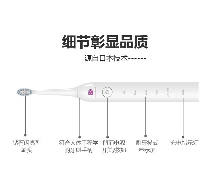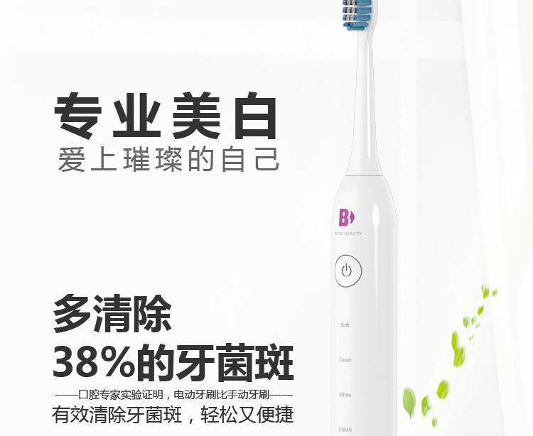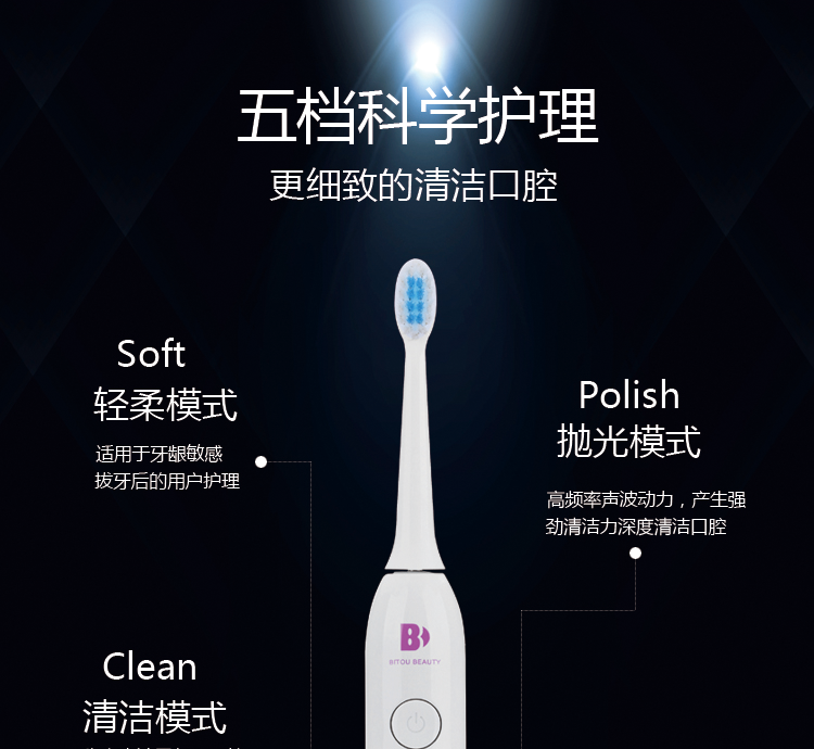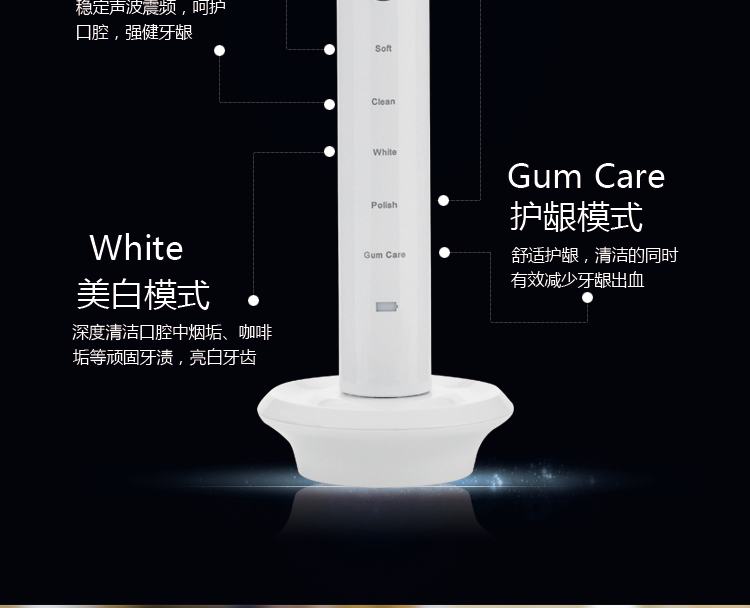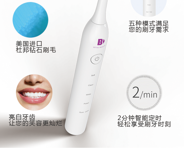 五檔刷牙模式:柔和 清潔 美白 拋光 按摩