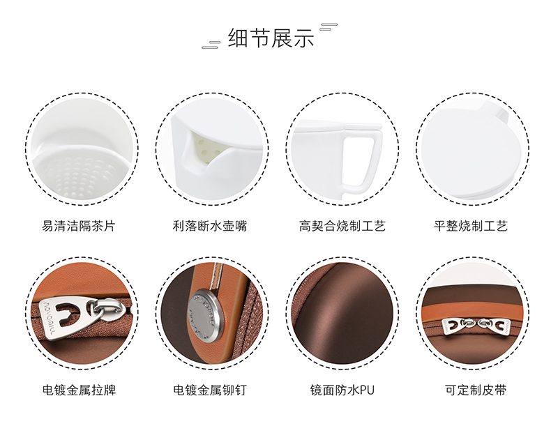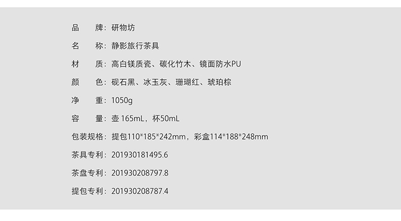 配置參數:彩盒X1, 便攜旅行包X1,隱形拓展茶盤X1, 陶瓷茶壺X1,陶瓷杯X4