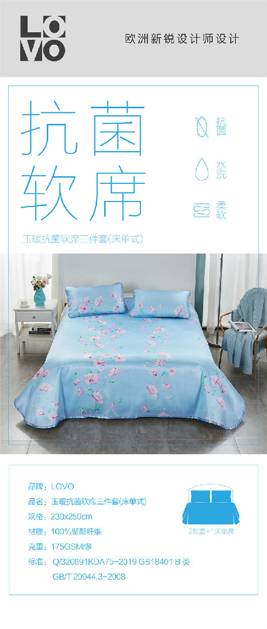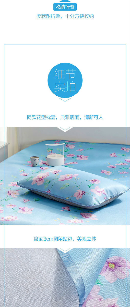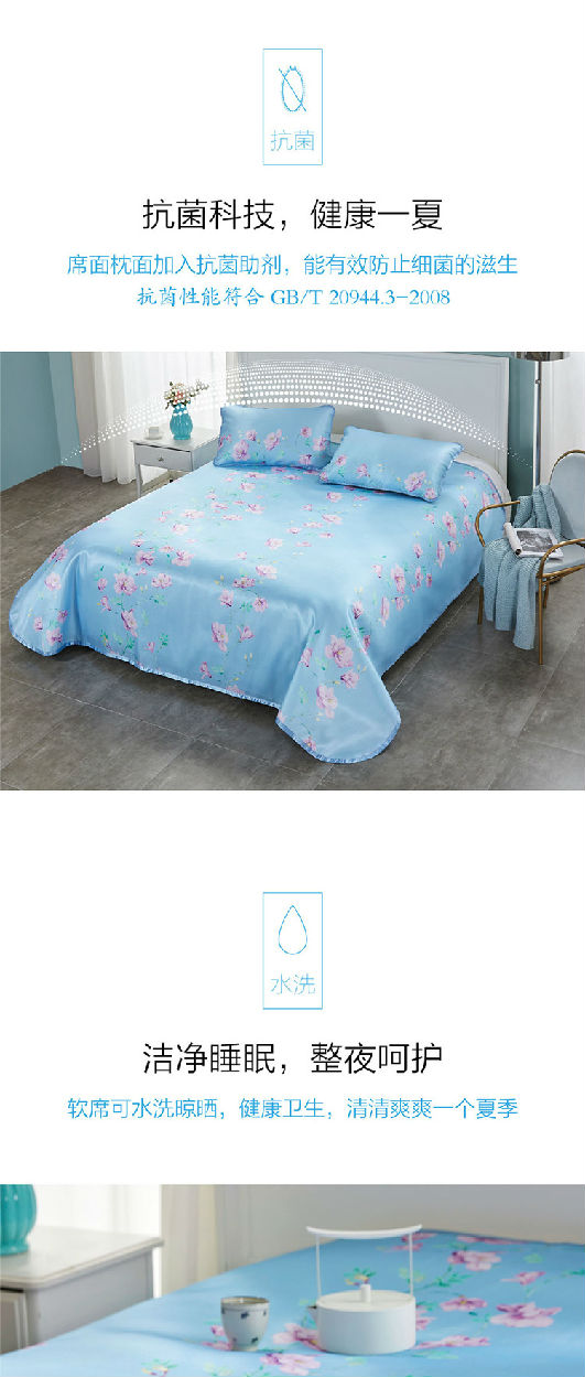 席面枕面加入抗菌助劑,能有效防止細(xì)菌的滋生;軟席可水洗晾曬,健康衛(wèi)生,清清爽爽一個(gè)夏季;材質(zhì)細(xì)膩,如床單般柔軟順滑,體感舒適,同時(shí)也十分仿版收納折疊。