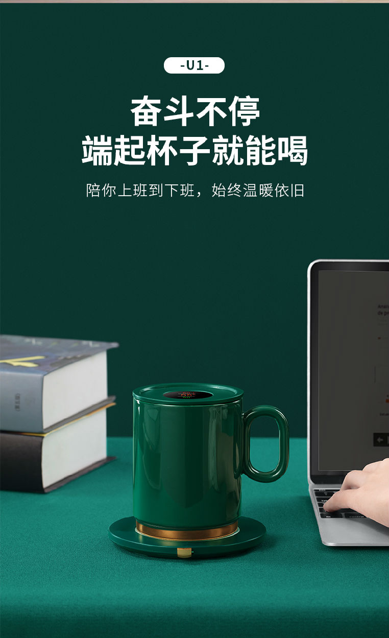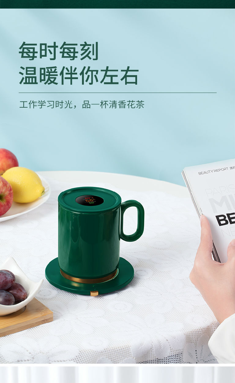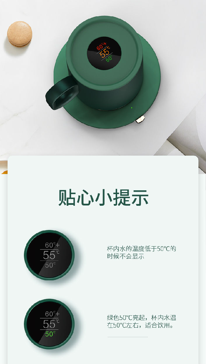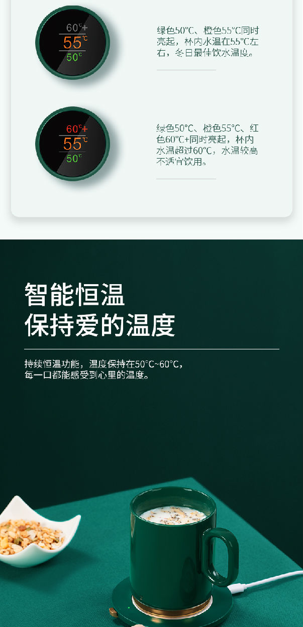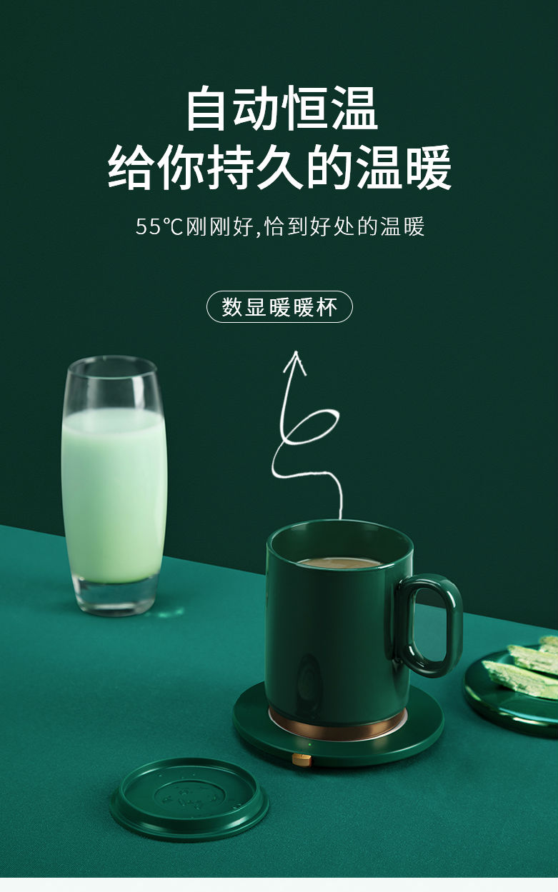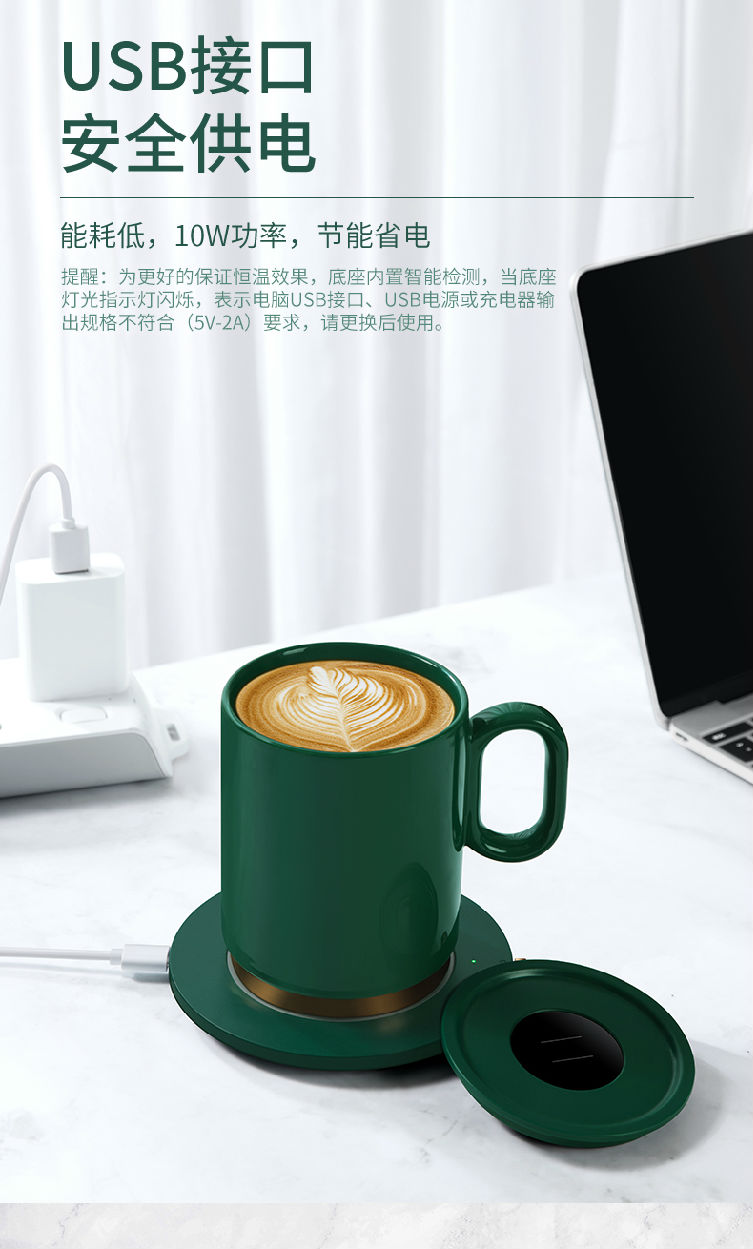 1、USB數(shù)據(jù)線鏈接,耗能更低,更節(jié)能 2、超薄底座,體積小,更節(jié)省桌面空間 3、制做精美,采用當下最流行的復(fù)古綠 4、杯蓋智能數(shù)字顯示,時刻掌握杯內(nèi)水溫 5、持續(xù)恒溫55-60度之間,隨時都能喝到溫水