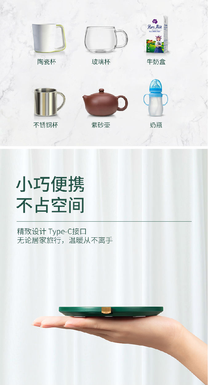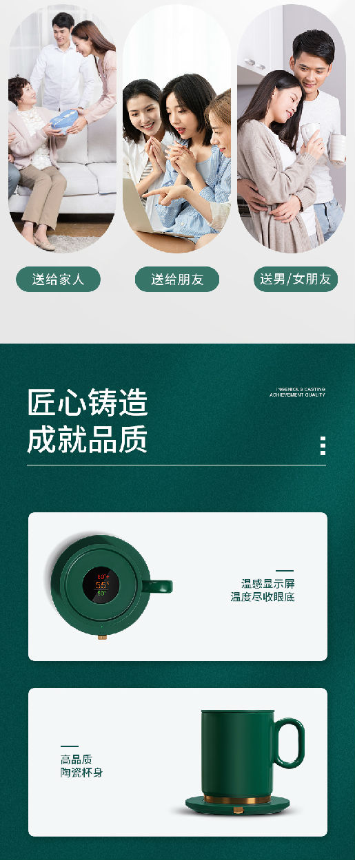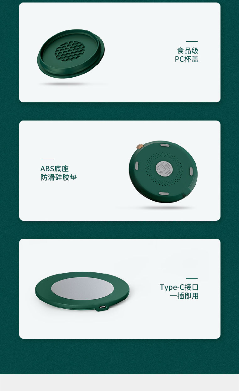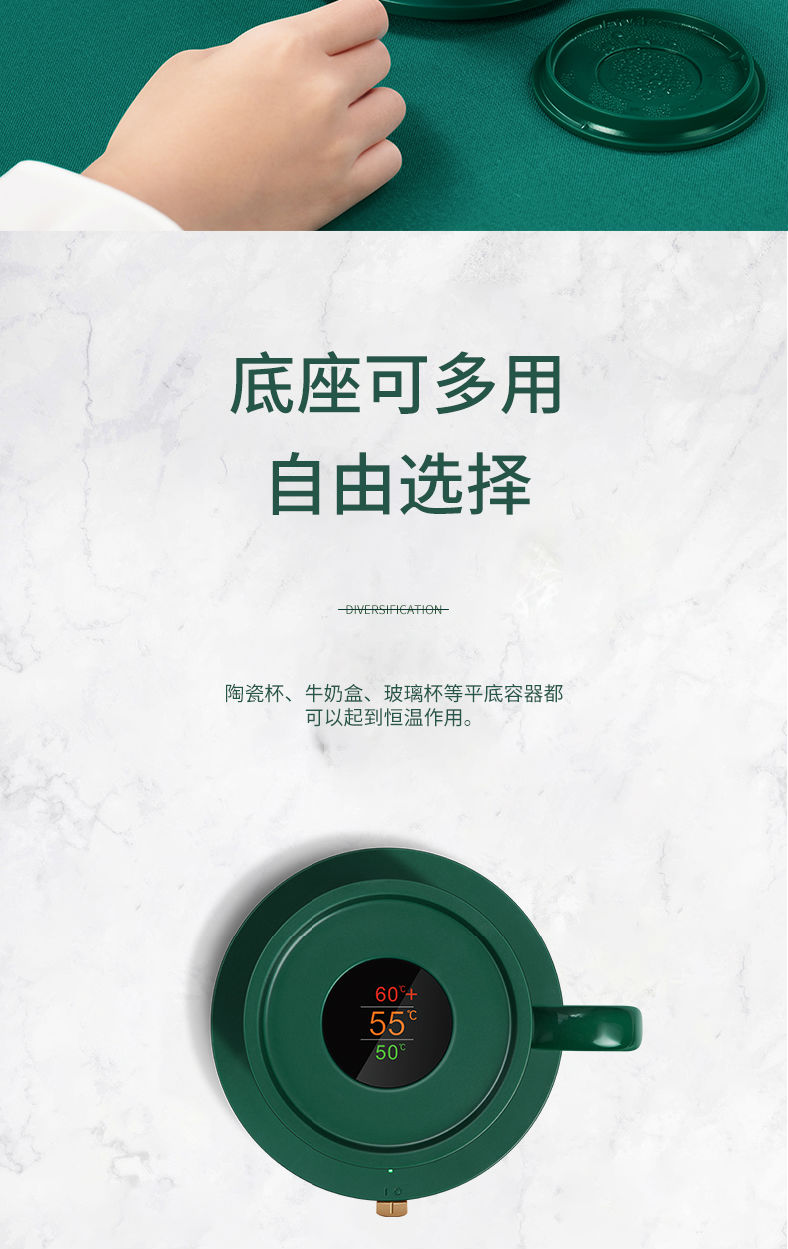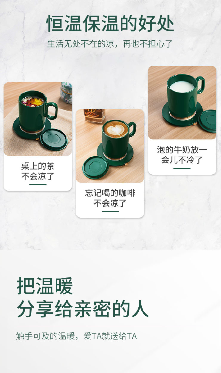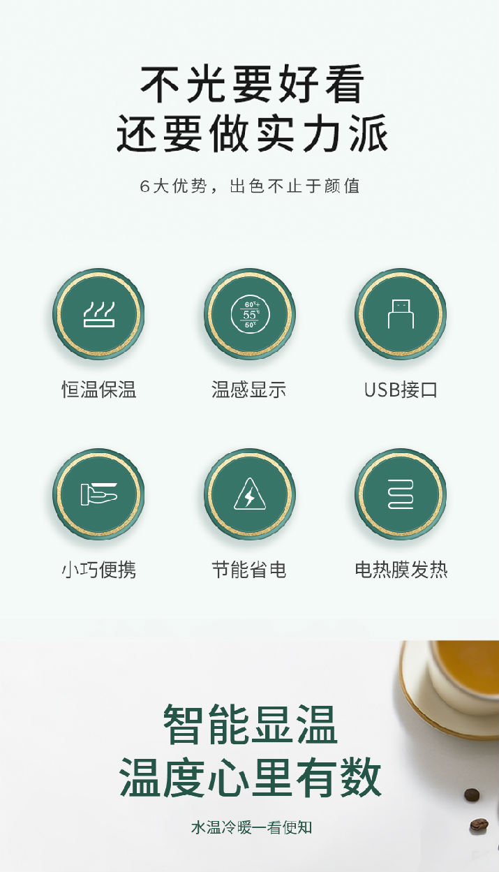 1、USB數(shù)據(jù)線鏈接,耗能更低,更節(jié)能 2、超薄底座,體積小,更節(jié)省桌面空間 3、制做精美,采用當下最流行的復(fù)古綠 4、杯蓋智能數(shù)字顯示,時刻掌握杯內(nèi)水溫 5、持續(xù)恒溫55-60度之間,隨時都能喝到溫水