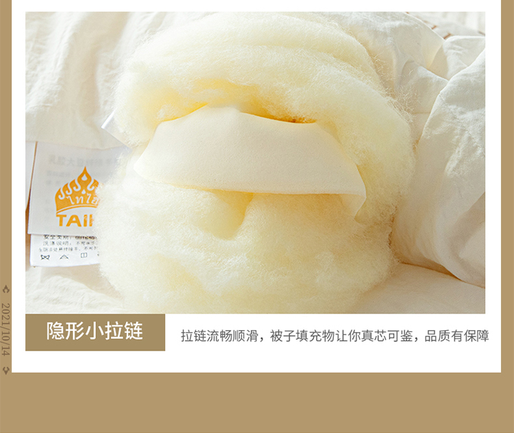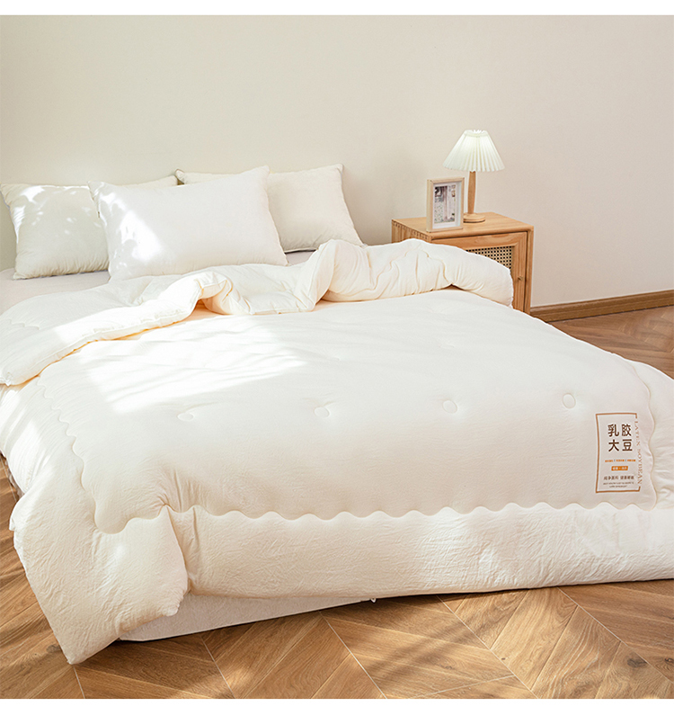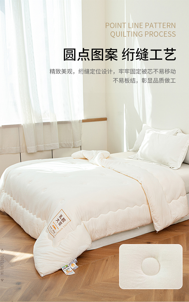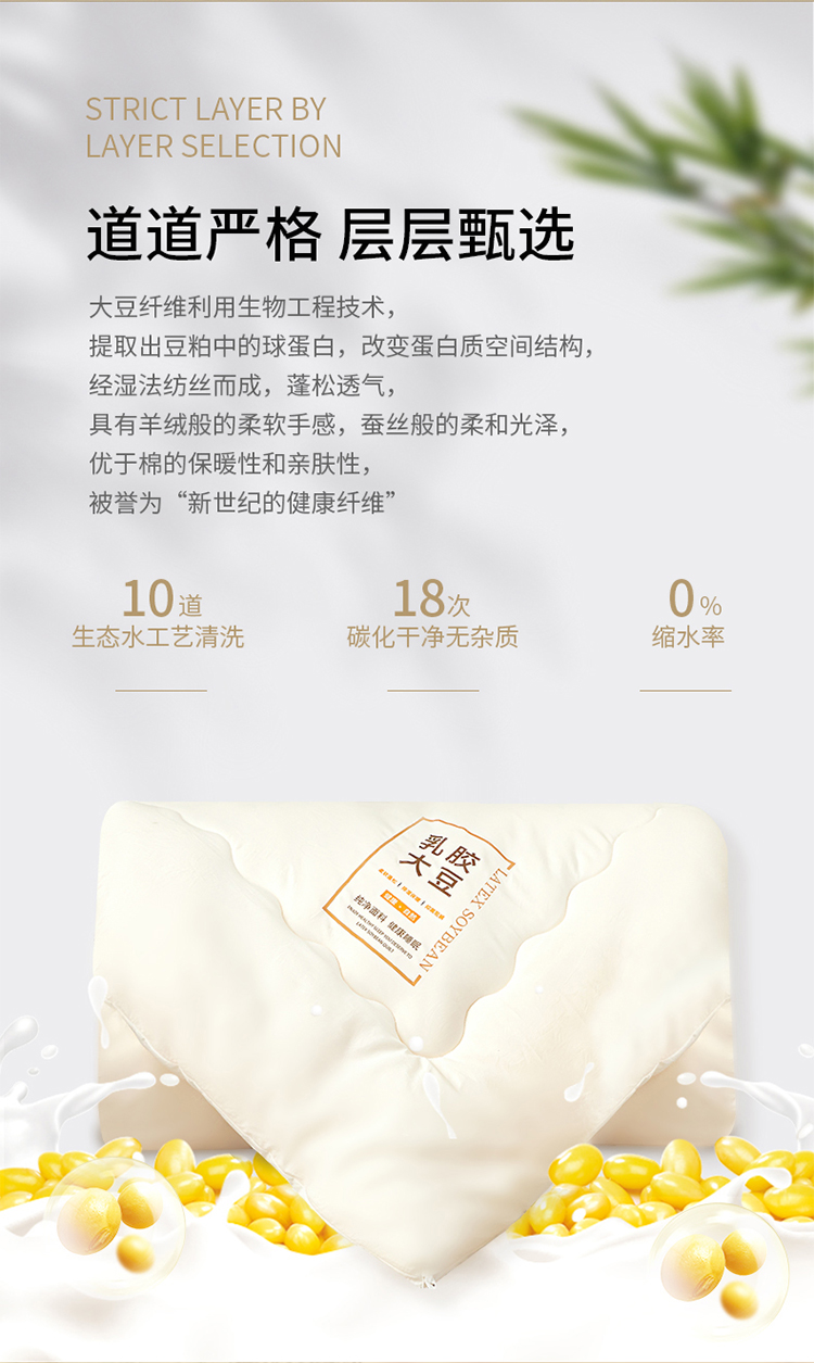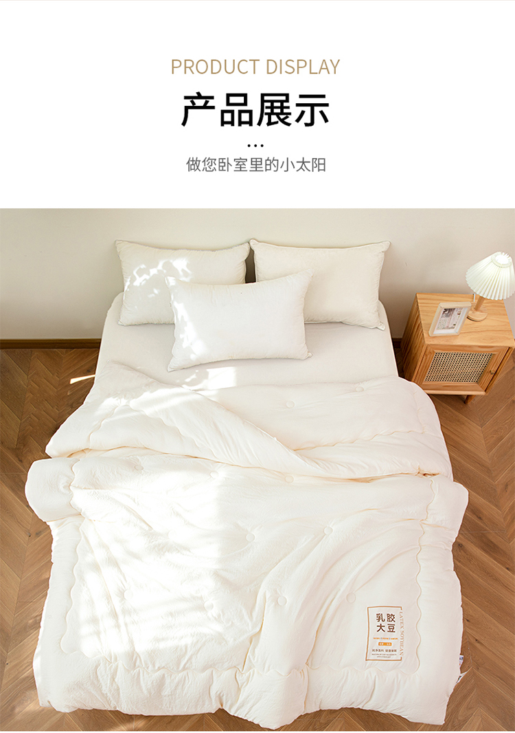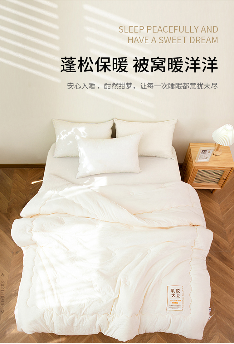 ?被子填充物:乳膠+大豆纖維(10%蛋白改性聚乙烯醇纖維+90%聚酯纖維)