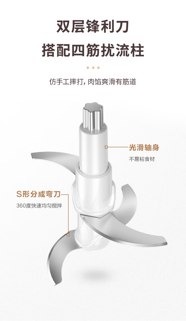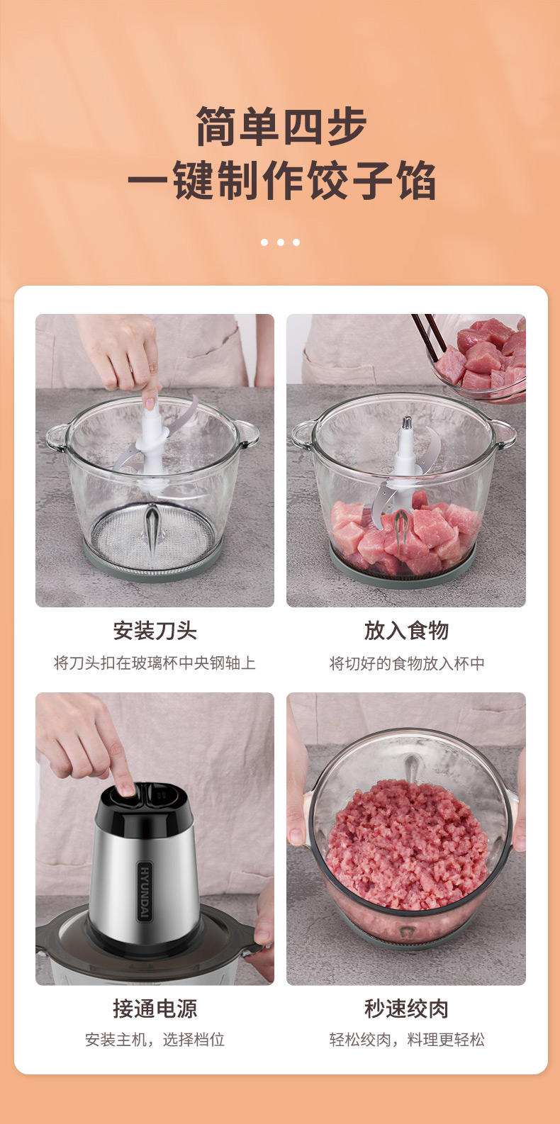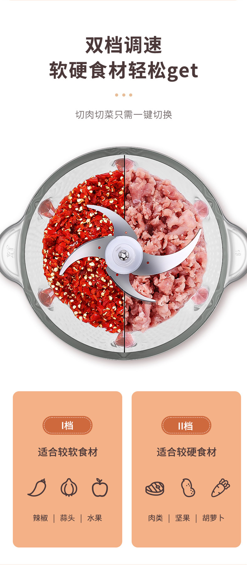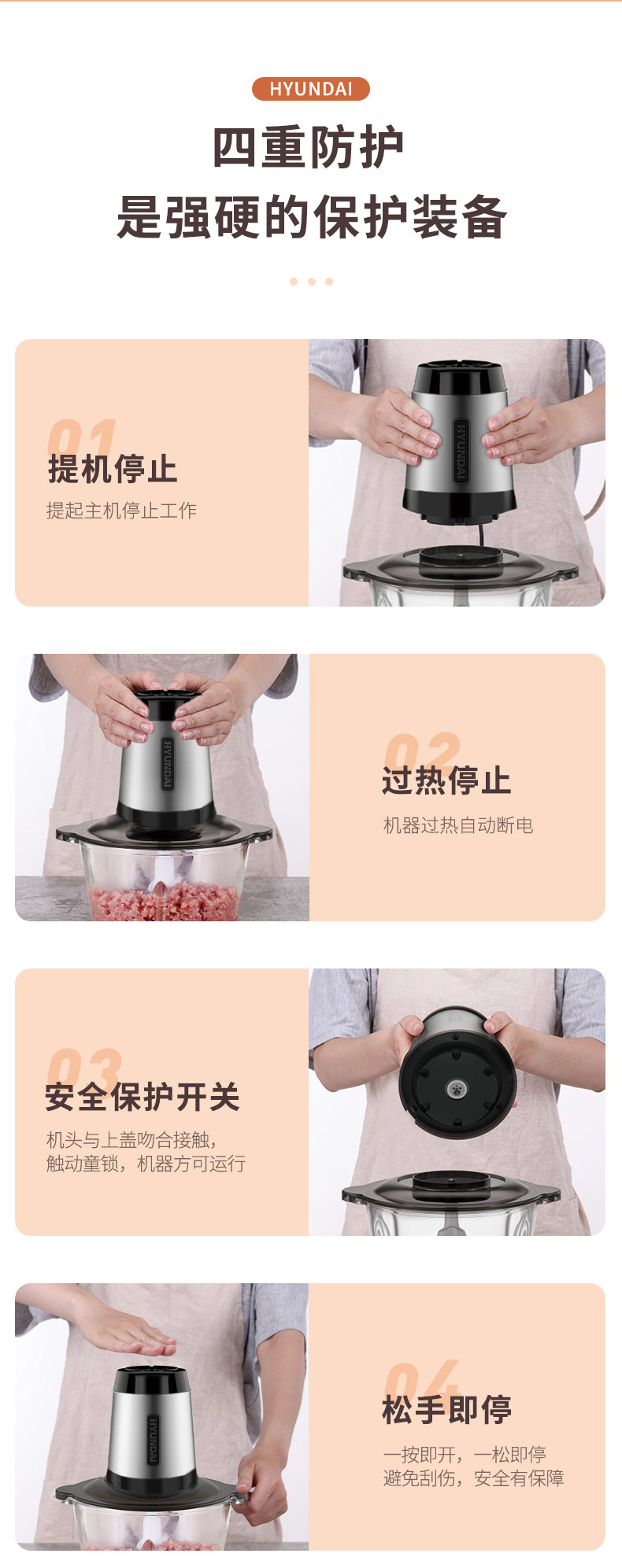 1、一鍵點動開關設計,快慢兩檔自由選擇 2、杯蓋密封防濺,健康潔凈 3、精鋼軸心,動力澎湃,秒速絞肉 4、可拆卸加厚刀片,雙層四刀不銹鋼刀片,輕松拆洗不藏垢 5、6mm加厚玻璃杯,硅膠防滑墊,有效防滑、降噪 6、雙重保護系統:智能微動安全保護裝置,安裝不到位無法開機工作;安全過熱保護裝置,保護核心部件壽命,使用安全
