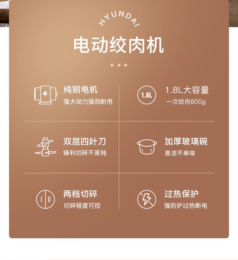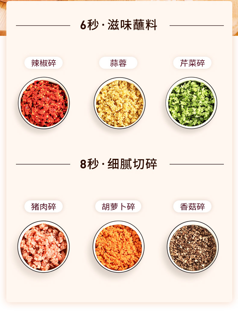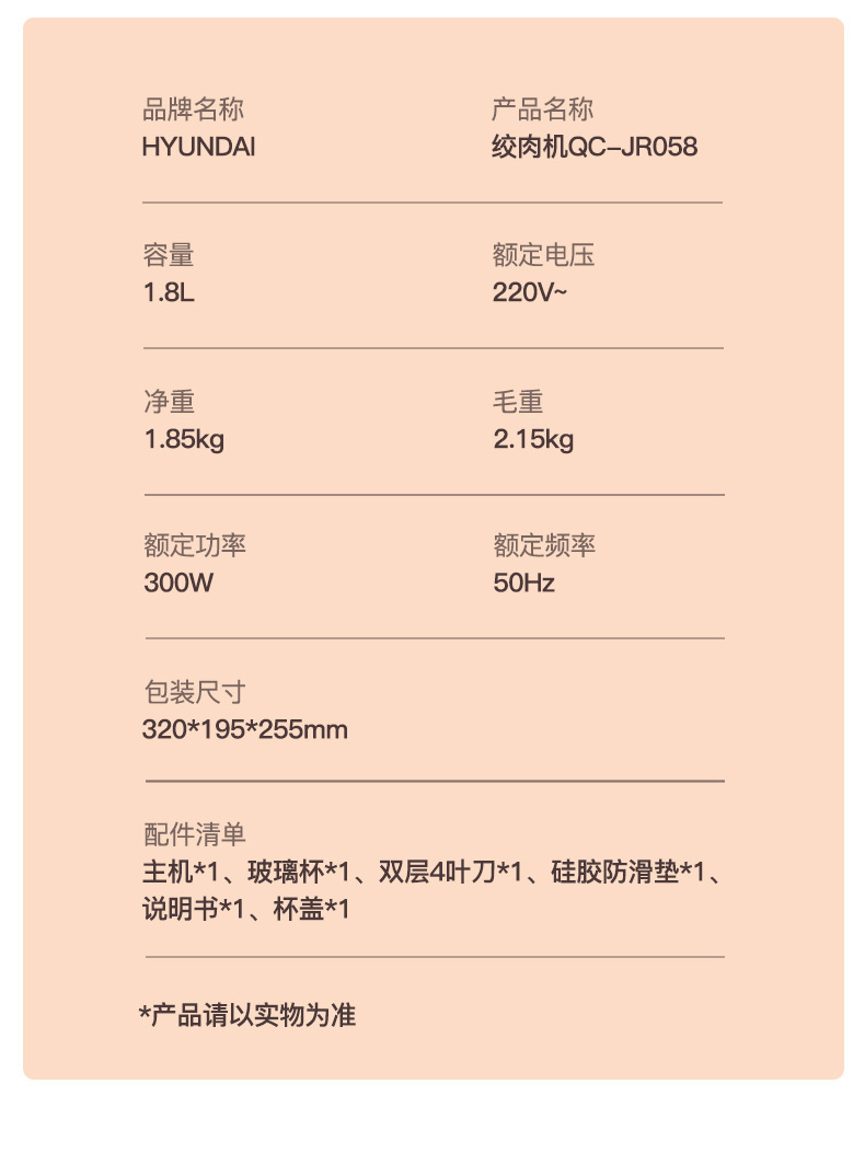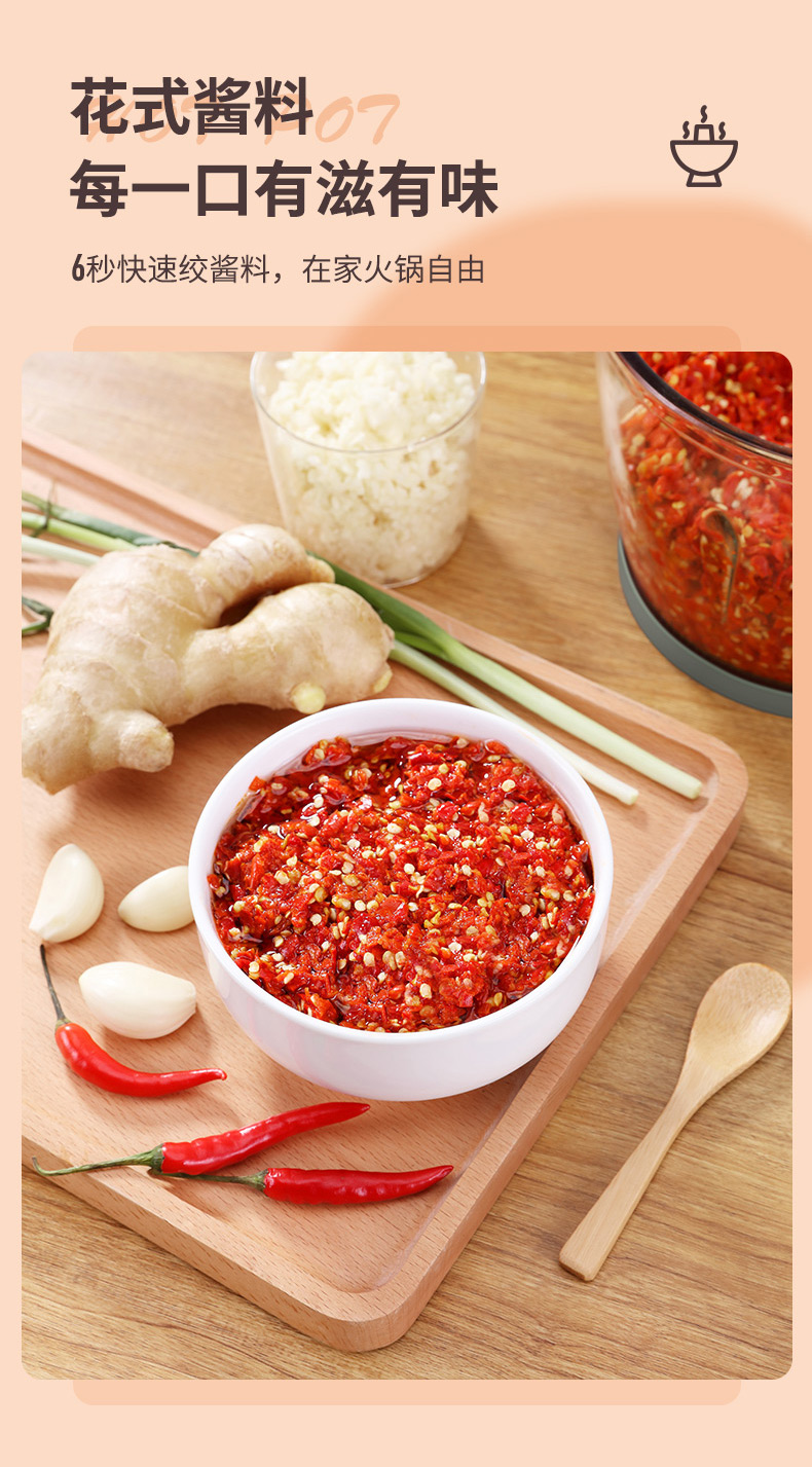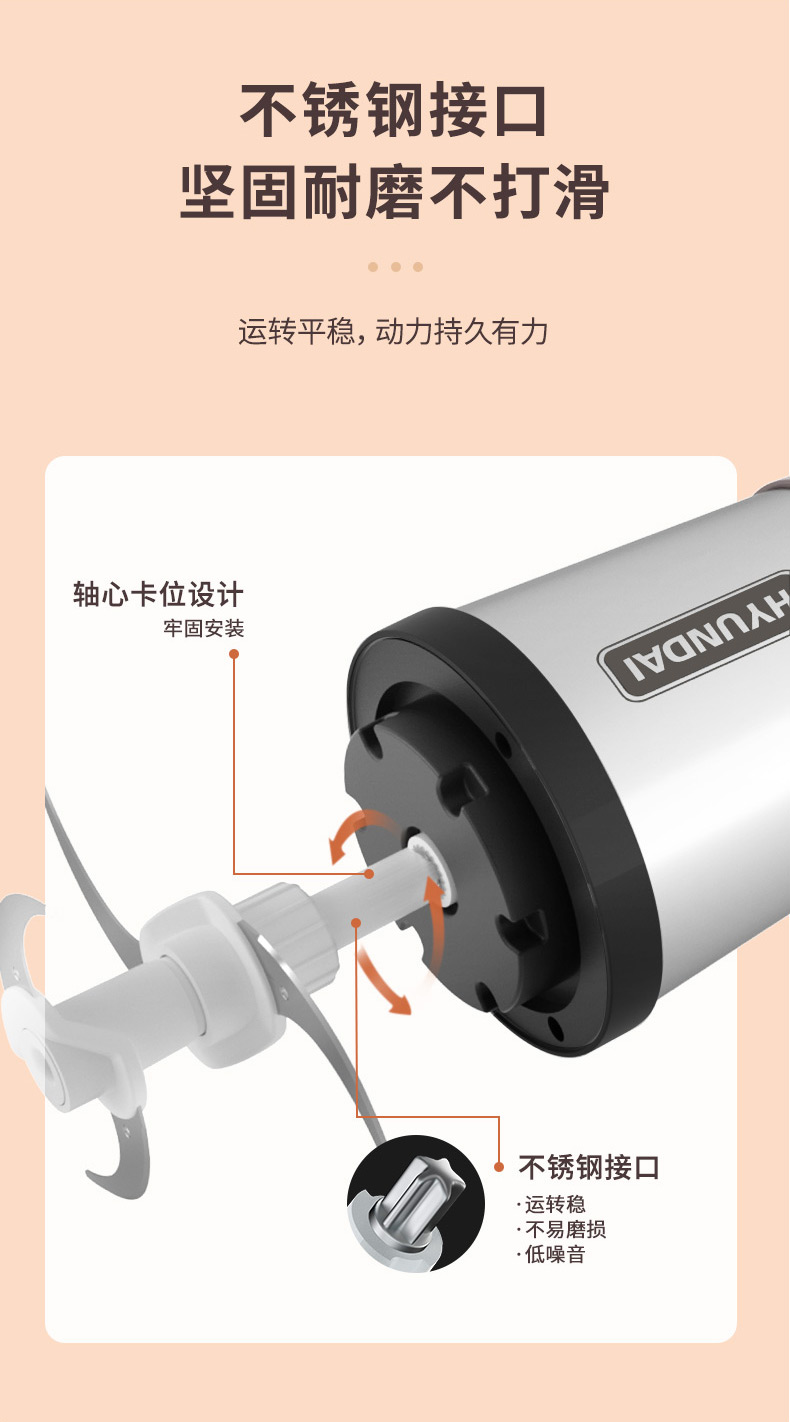 1、一鍵點動開關設計,快慢兩檔自由選擇 2、杯蓋密封防濺,健康潔凈 3、精鋼軸心,動力澎湃,秒速絞肉 4、可拆卸加厚刀片,雙層四刀不銹鋼刀片,輕松拆洗不藏垢 5、6mm加厚玻璃杯,硅膠防滑墊,有效防滑、降噪 6、雙重保護系統:智能微動安全保護裝置,安裝不到位無法開機工作;安全過熱保護裝置,保護核心部件壽命,使用安全
