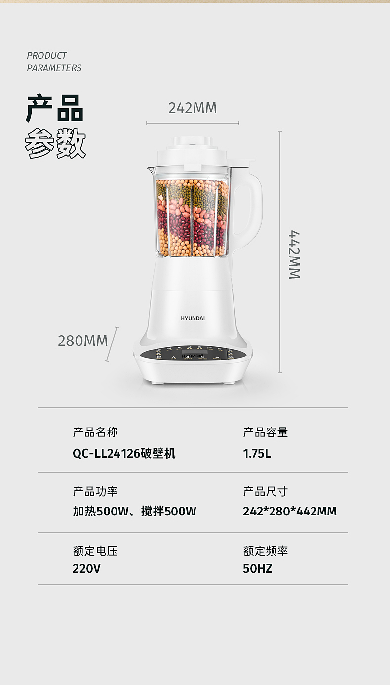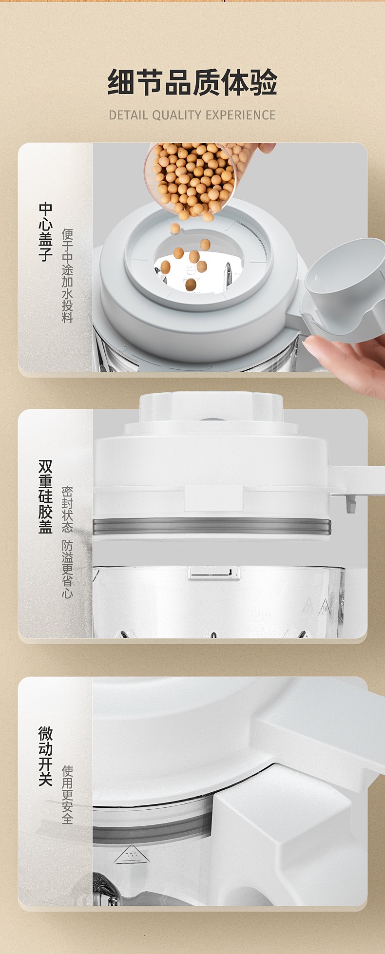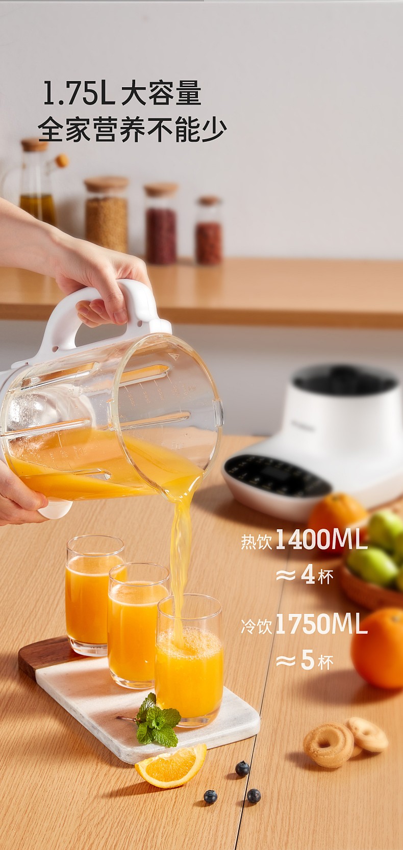 1、過熱安全保護;高溫自動斷電; 2、1.75L容量,24小時預約功能; 3、杯蓋微動保護,杯蓋未扣好不能啟動 ; 4、防燙把手,高硼硅玻璃杯,驟冷驟熱不易裂,安全耐用防滑腳墊設計; 5、防糊底涂層,不銹鋼304材質8葉精鋼刀;6、根擾流徑,細膩粉碎,堅硬耐磨; 7、輕薄底座設計,拿取不費力。
